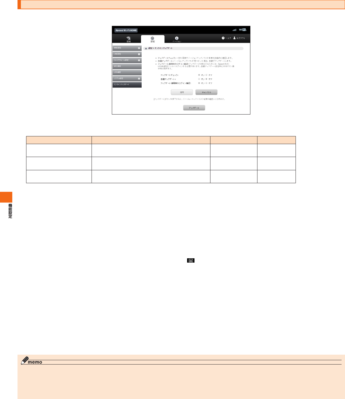SpeedWi-FiHOME設定ツールへログインして「アップデート」を選択する