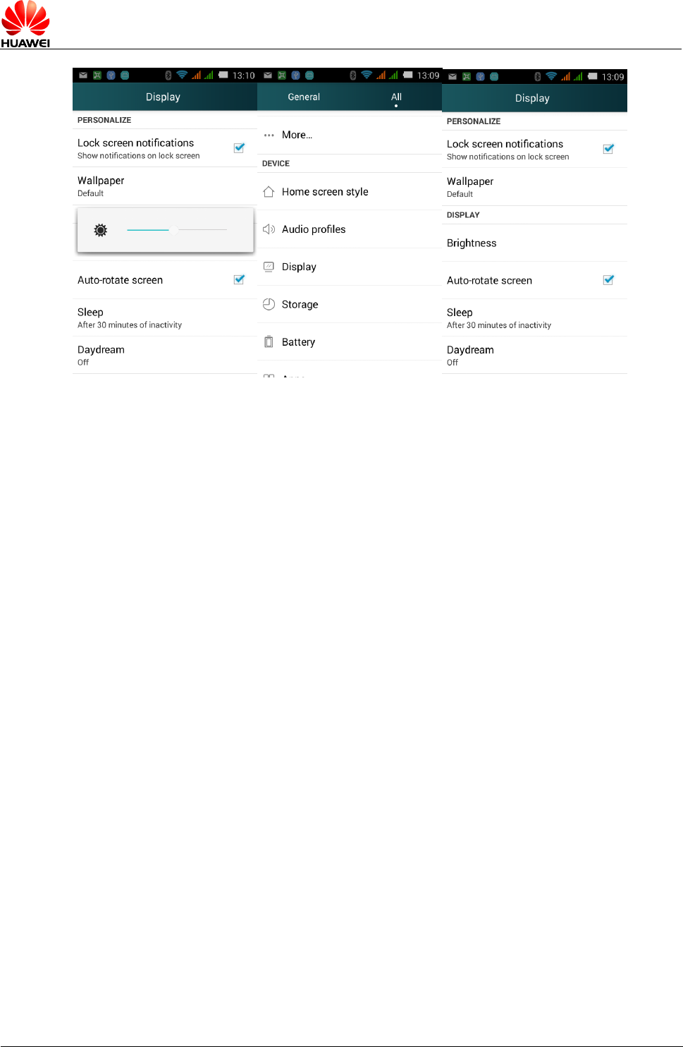 all>display >brightness, set up the screen brightness.