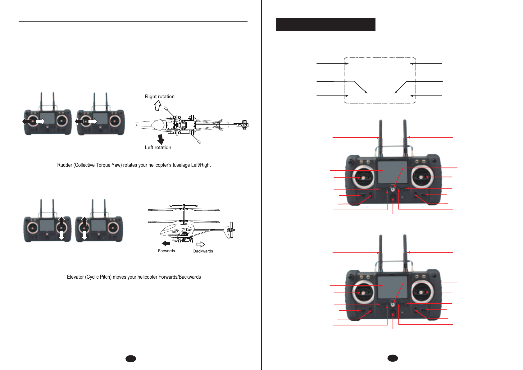 Rudder (Collective Torque Yaw) rotates your helicopter’s fuselage Left / Right