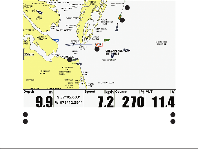 indicated on-screen by a directional boat icon if the boat is moving or a round symbol if the boat is stationary.
