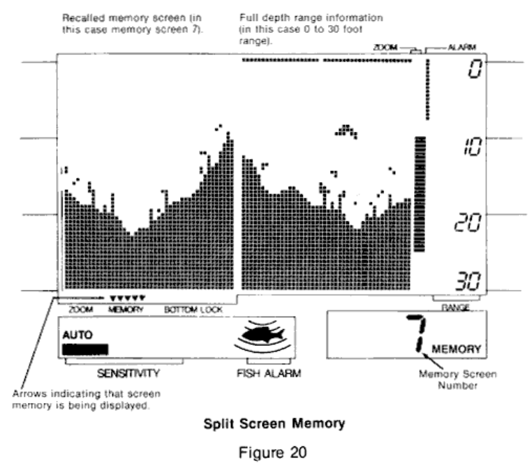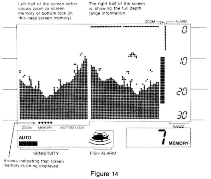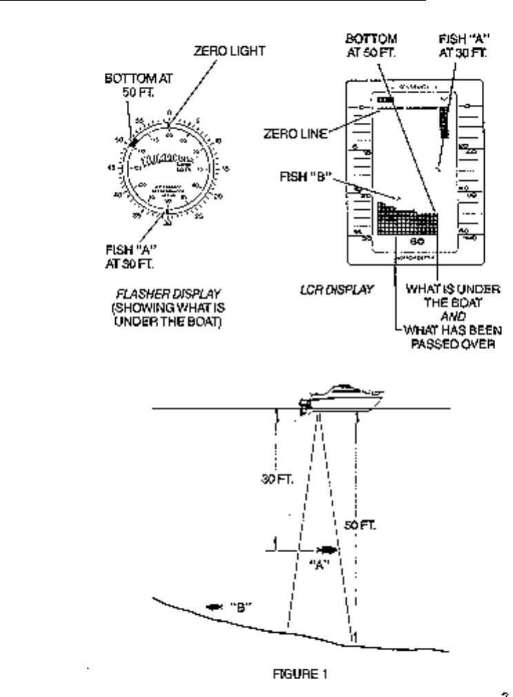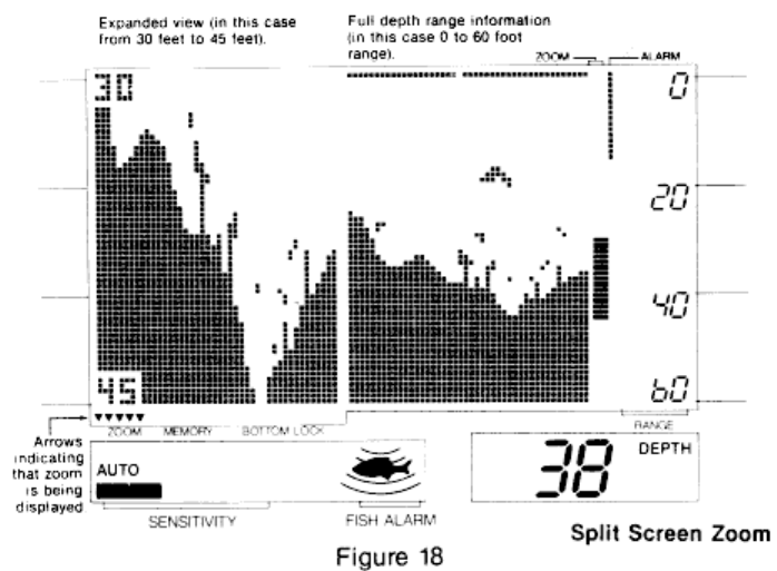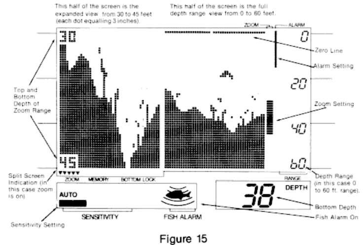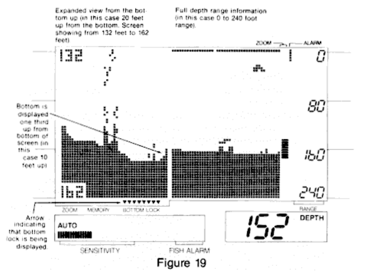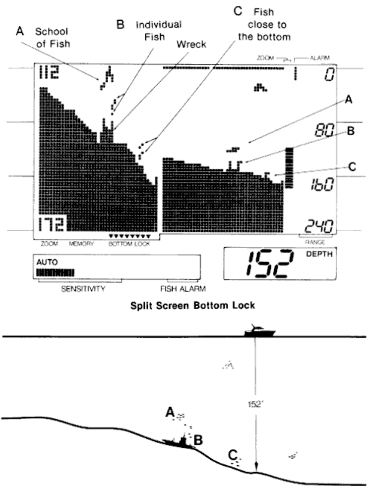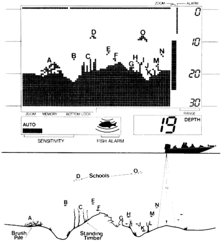 The following illustrations show some typical displays with bottom, structure, and fish returns.