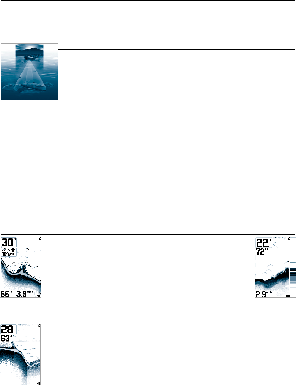 indicates the intensity of the sonar return. Targets detected in the narrow beam directly under the boat appear as Solid Fish