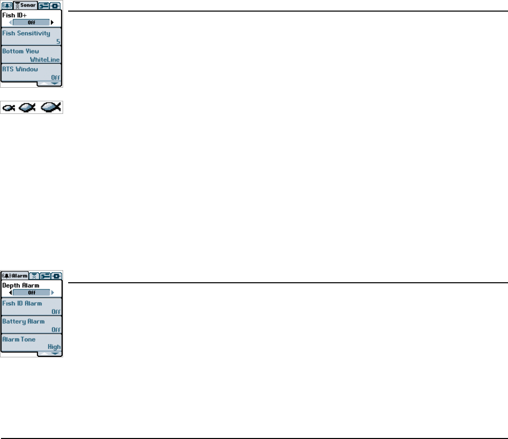 Menu System). When a target is detected, a Fish ID+TM symbol appears on the display with the depth. The size of the symbol