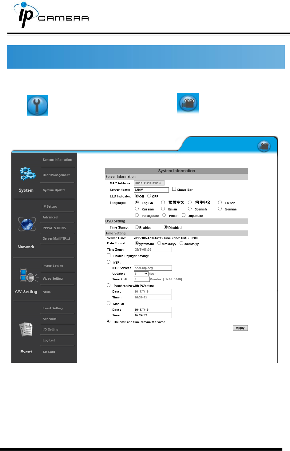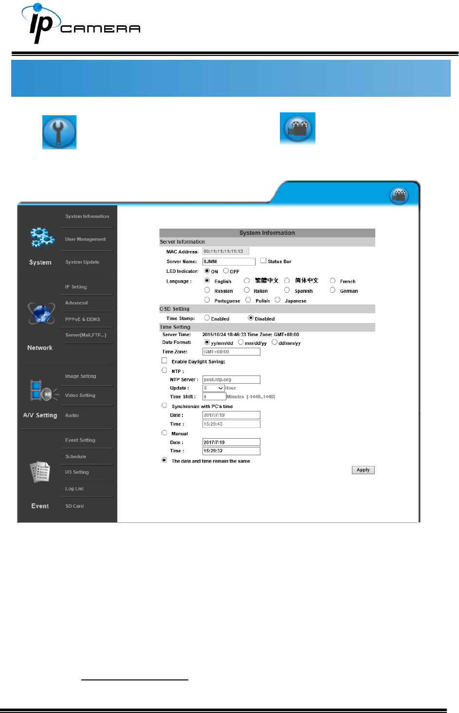 • Re-login the camera using the default IP (http://192.168.1.200), and user