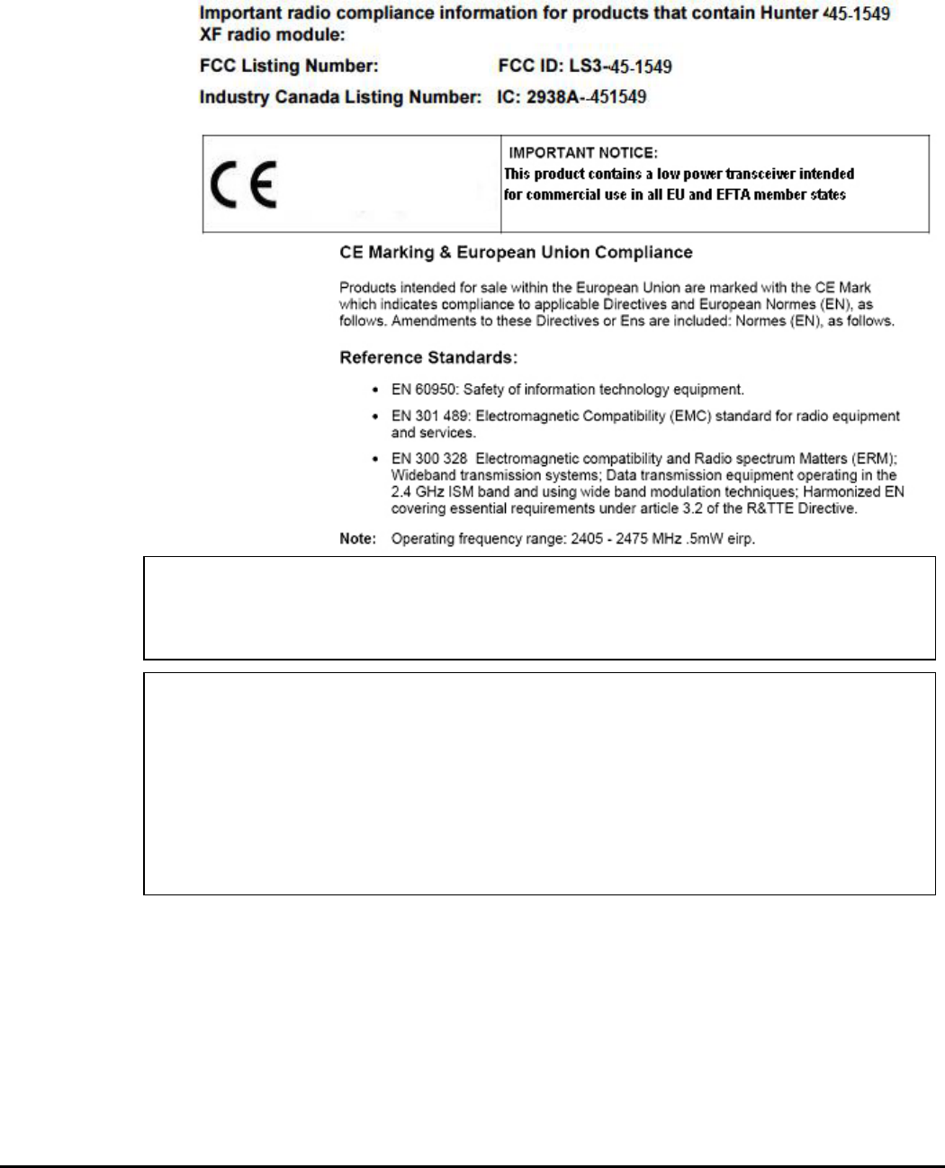 Hunter Engineering 45-1549 Hunter Model 45-1549, XF Wireless Communication Network Radio User Manual CERTIFICATE OF COMPLIANCE