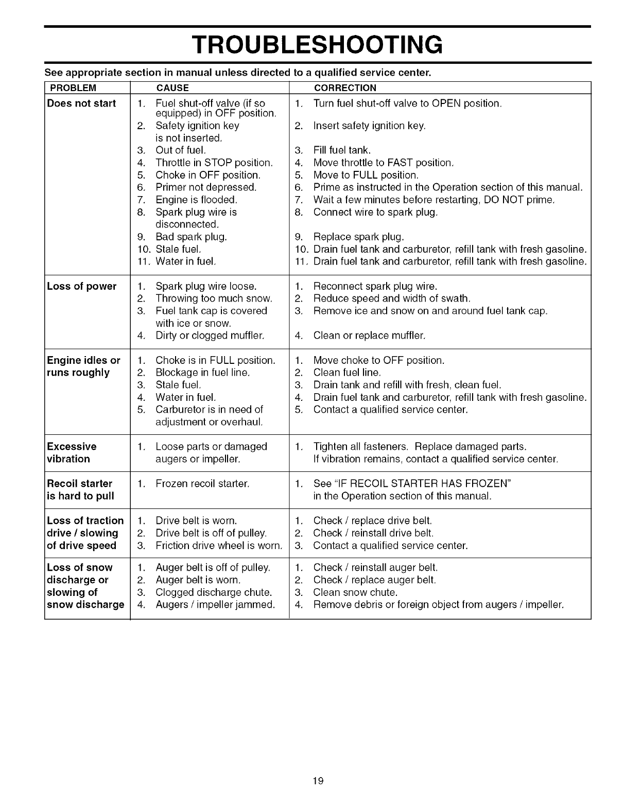 inthe maintenance section of the Owner's/Operator's manual Should an operational problem or failure occur,