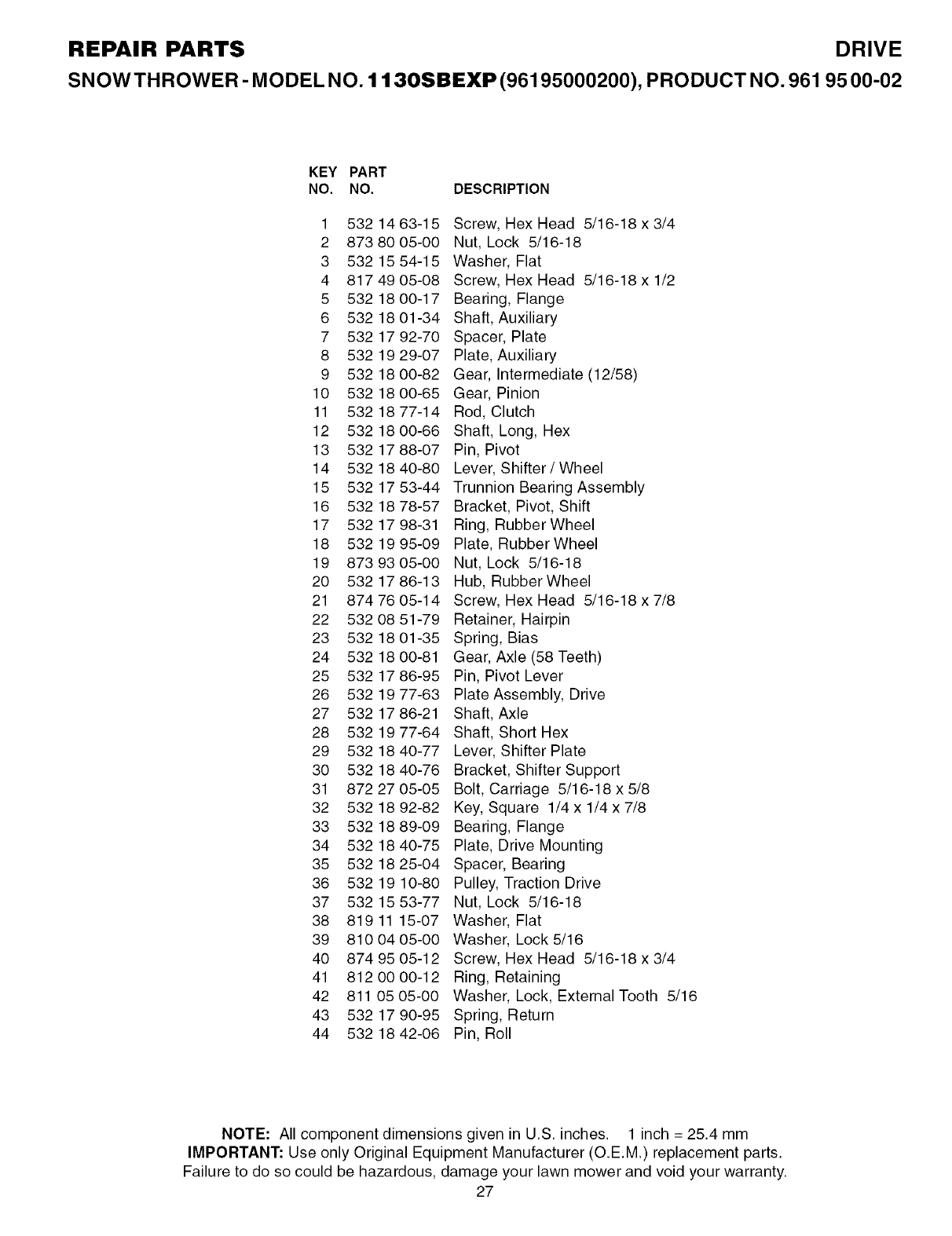 User Manual: Husqvarna 1130SBEXP 1130SBEXP HUSQVARNA SNOWTHROWER - Manuals and Guides View the owners manual for your HUSQVARNA SNOWTHROWER #1130SBEXP. Home:Lawn & Garden Parts:Husqvarna Parts:Husqvarna SNOWTHROWER Manual