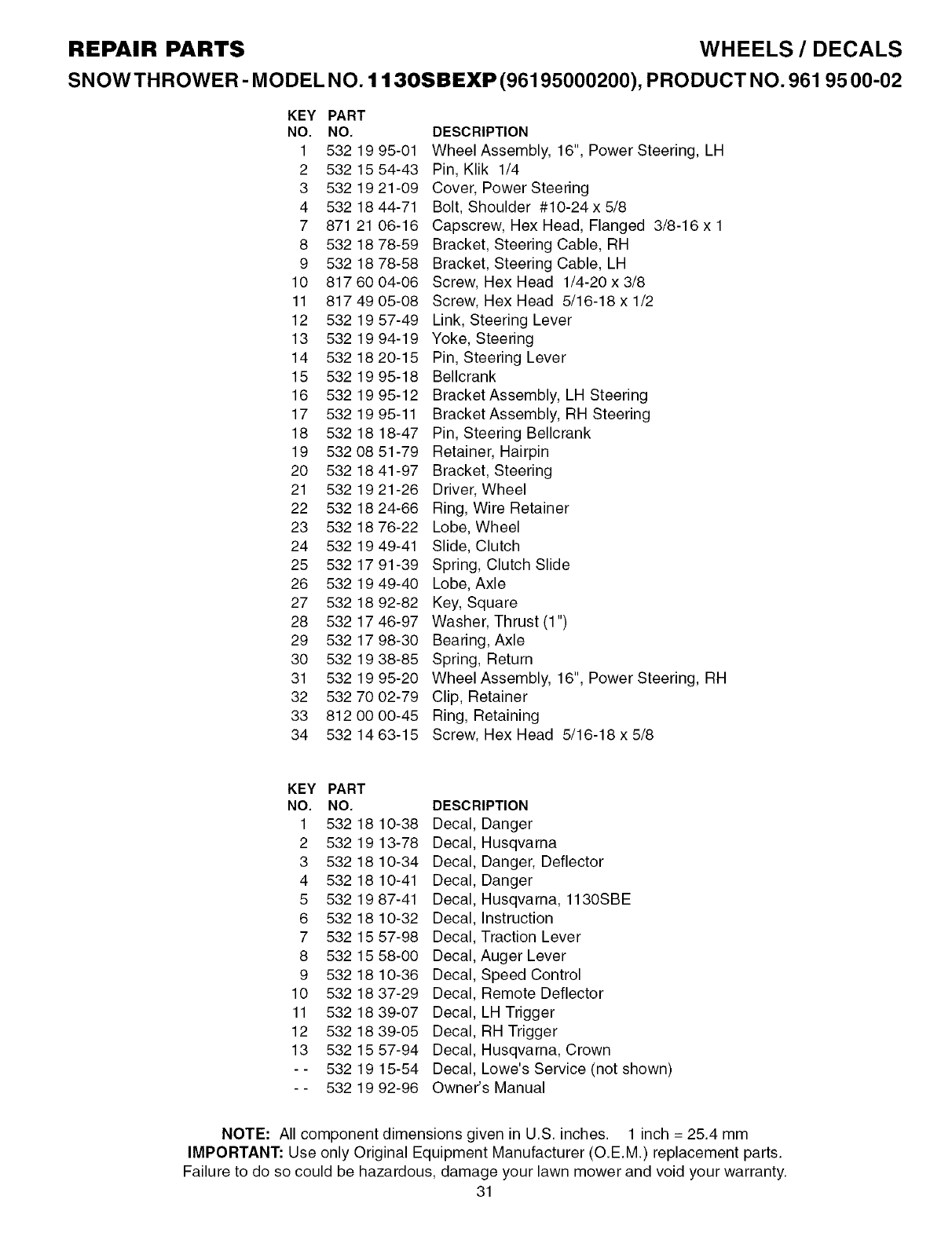 tion sheet furnished by Husqvarna;