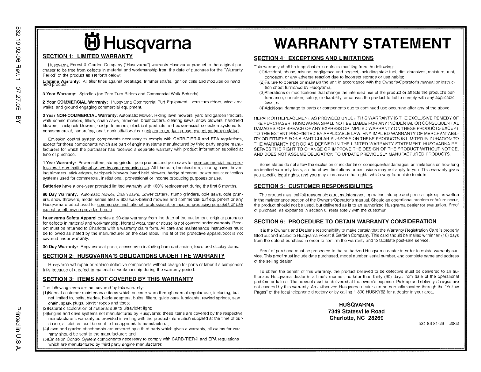 SECTION 2: HUSQVARNA'S OBLIGATIONS UNDER THE WARRANTY