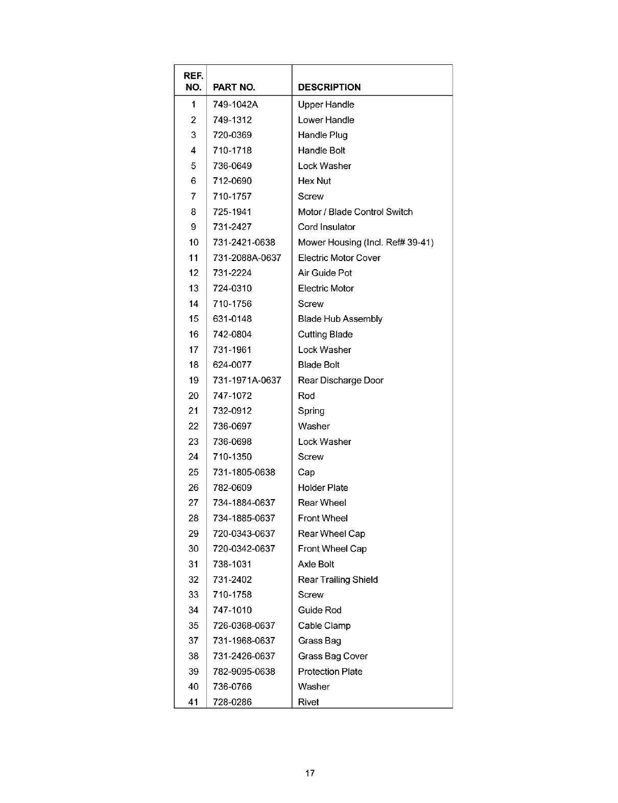blades, blade adapters, grass bags. rider deck wheels, seats.