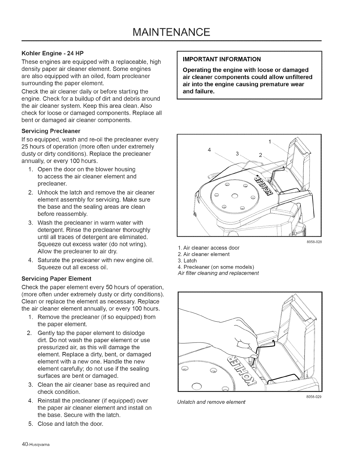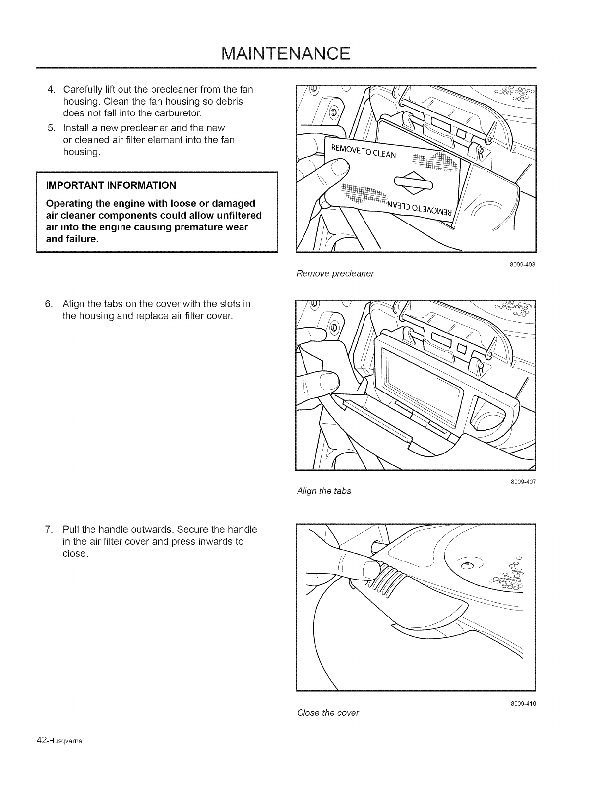 Replace the air cleaner's pre-filter (foam) (300 hours).
