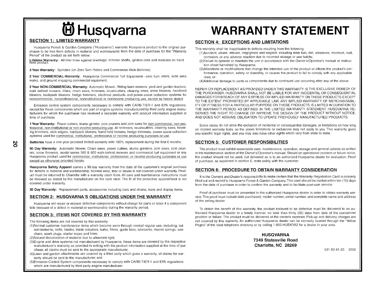 SECTION 2: HUSQVARNA'S OBLIGATIONS UNDER THE WARRANTY