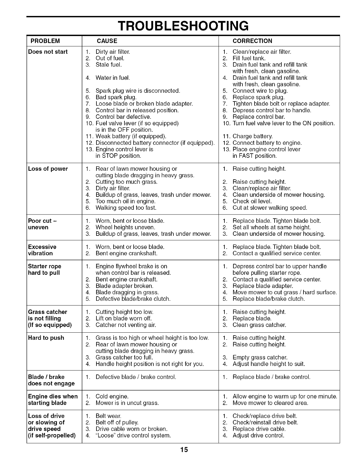 in the maintenance section of the Owner's/Operator's manual. Should an operational problem or failure occur,