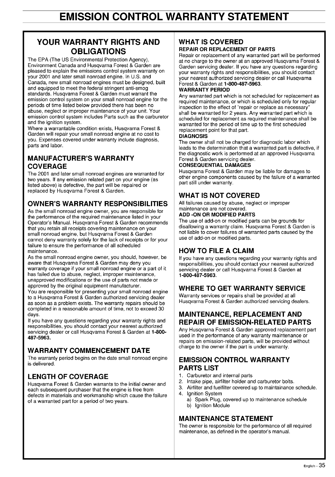 servicing dealer or call Husqvarna Forest & Garden at 1-800-