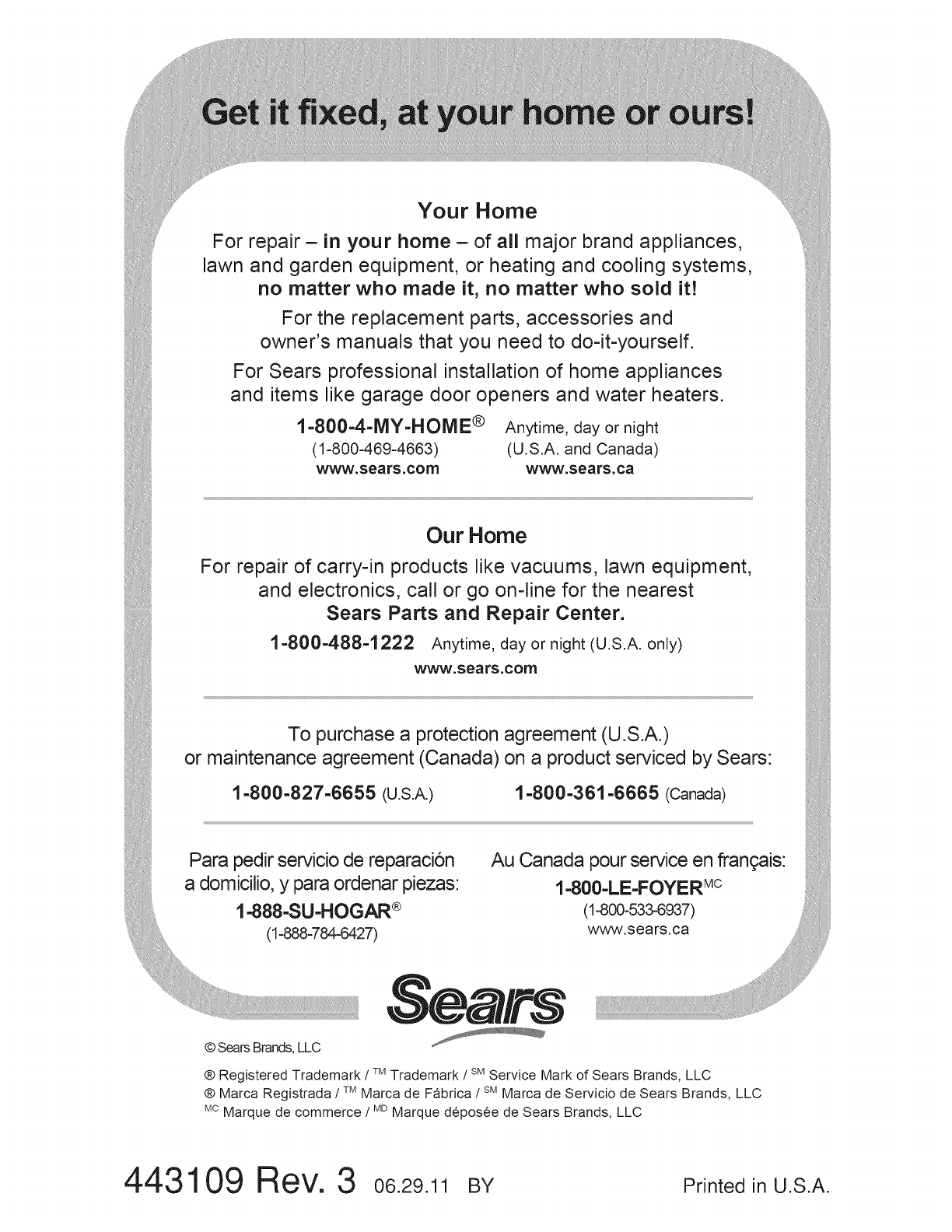 ® Marca Registrada /TMMarca de Fabrica /SMMarca de Servicio de Sears Brands, LLC