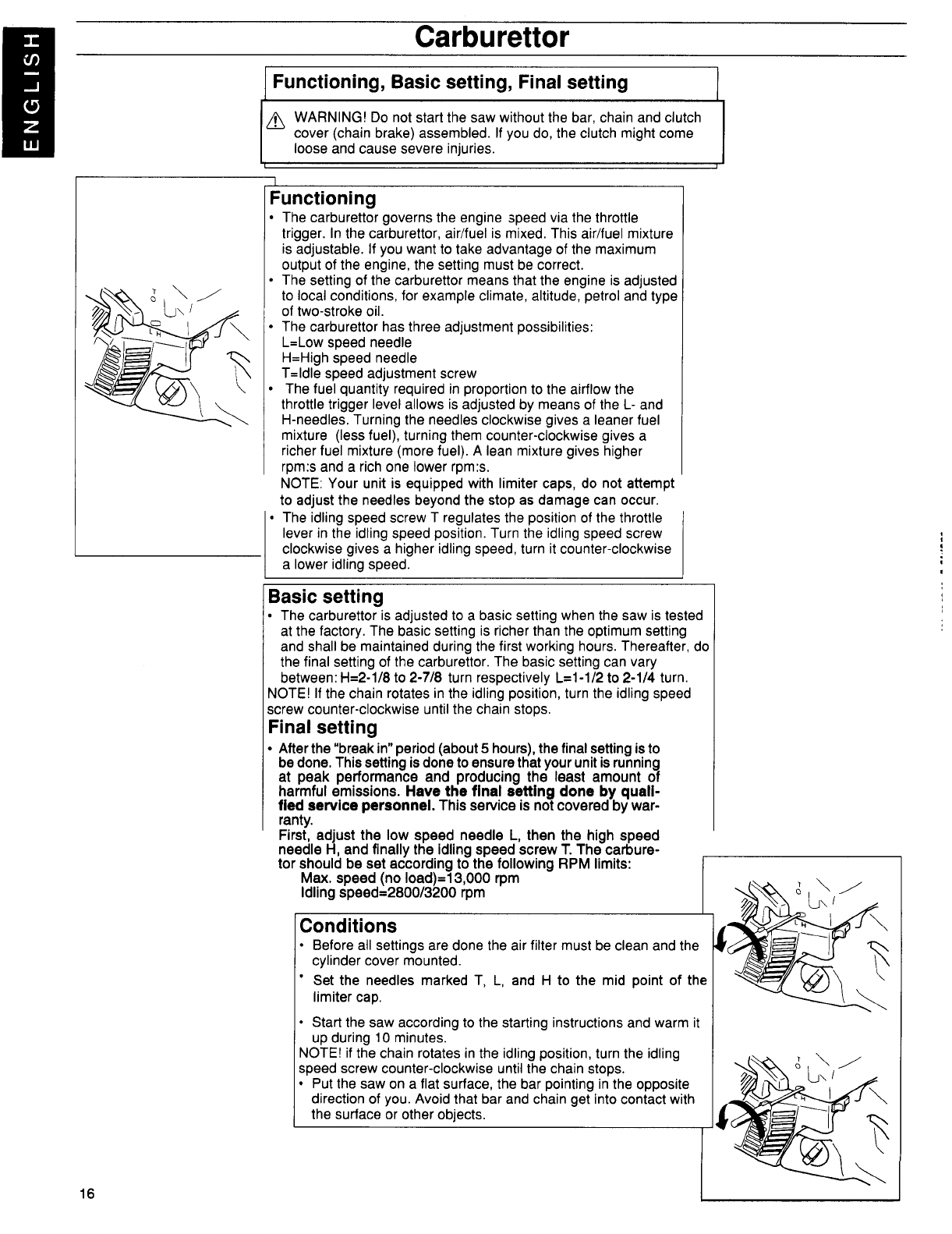 ●Start the saw and check the carburetor adjustment (page 16-17).