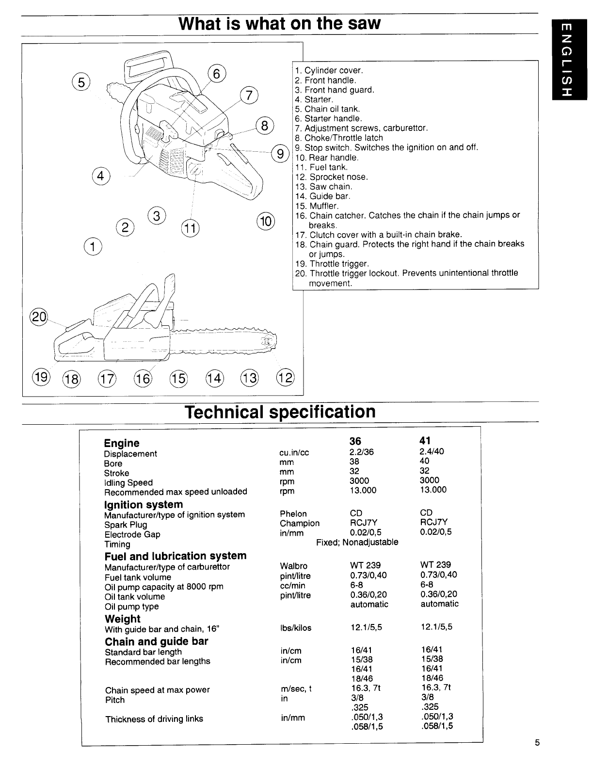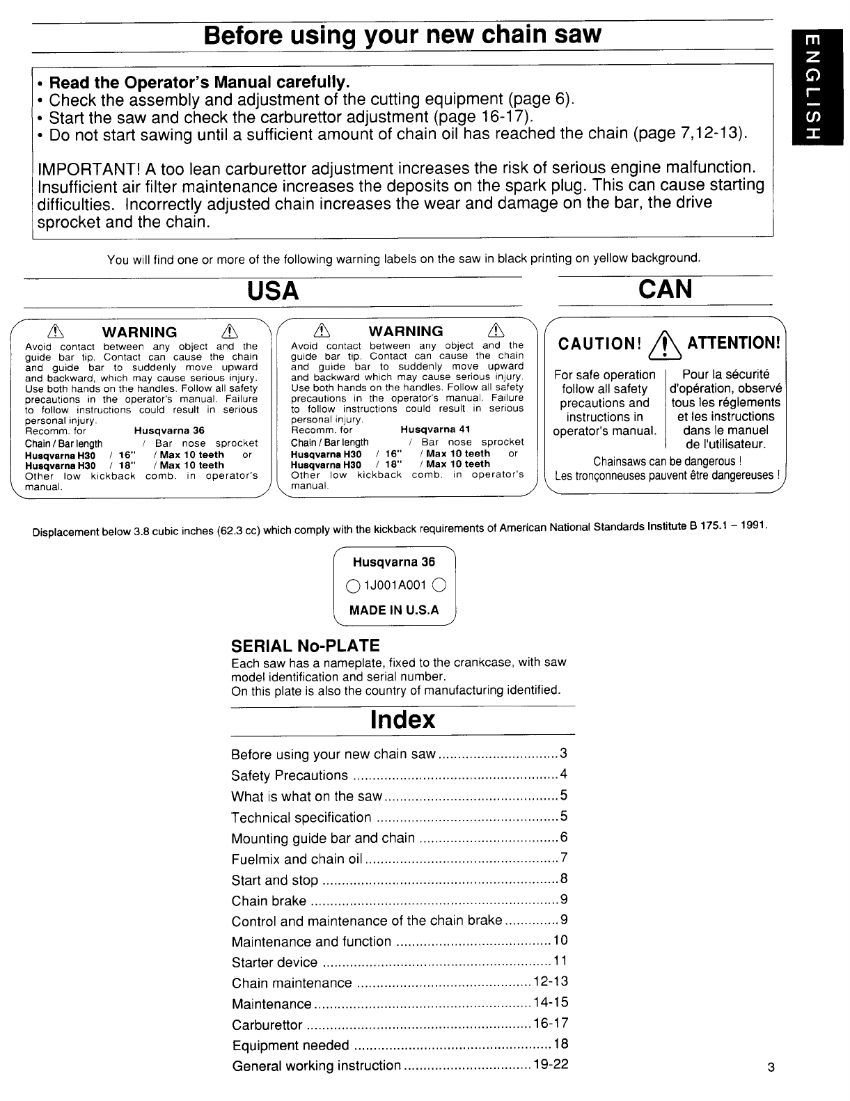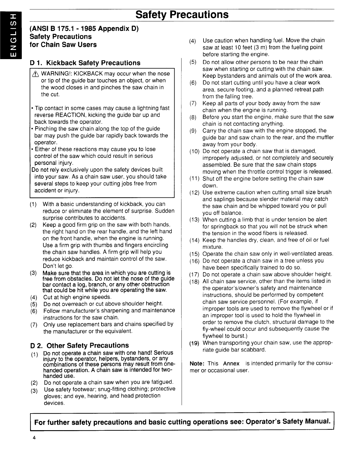 Displacementbelow3.8 cubic inches(62.3cc)whichcomplywiththekickbackrequirementsofAmericanNationalStandardsInstitutaB175.1–1991.