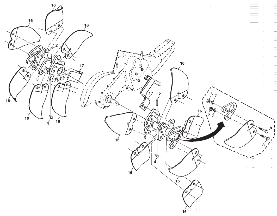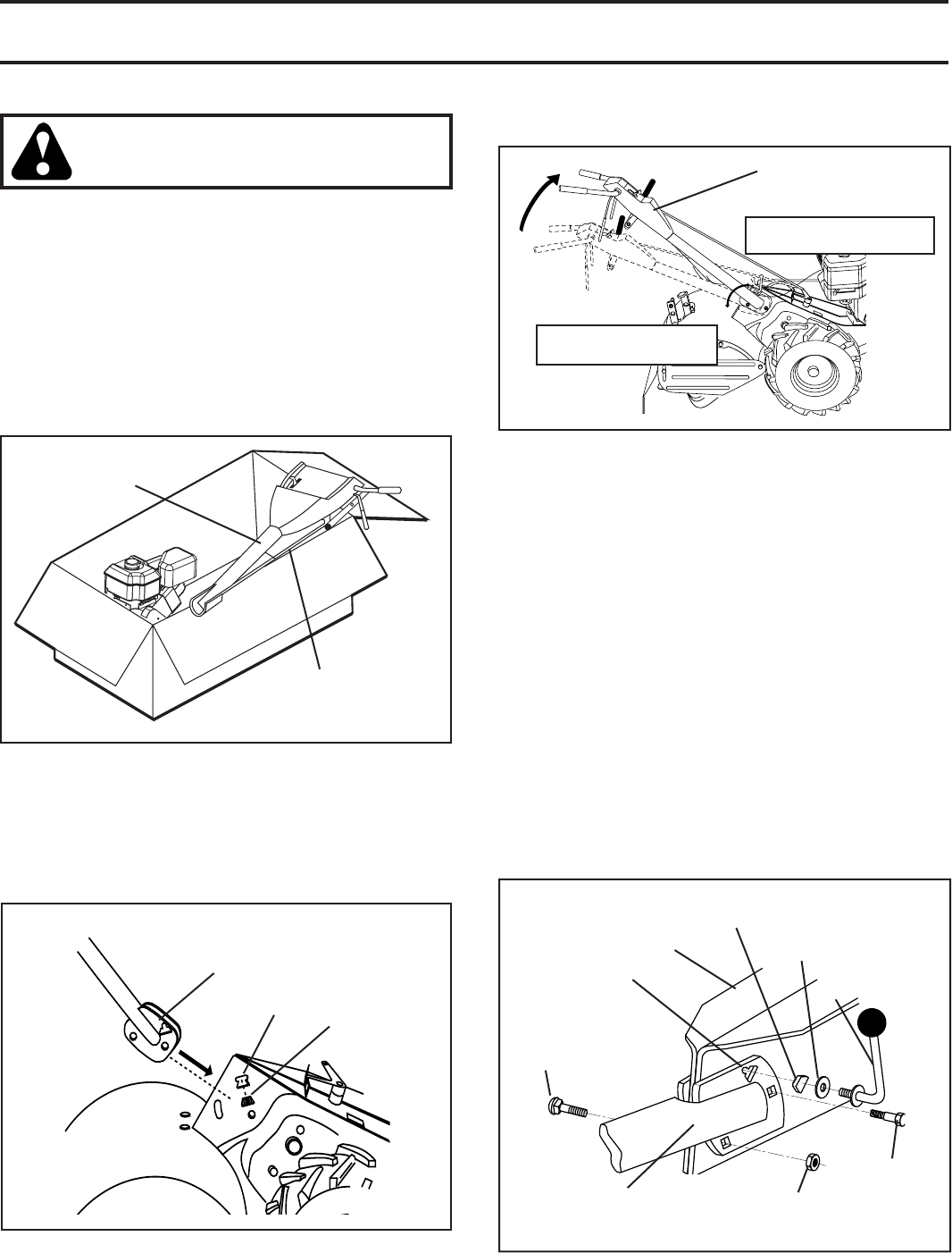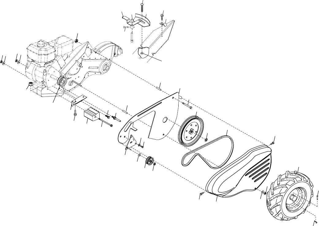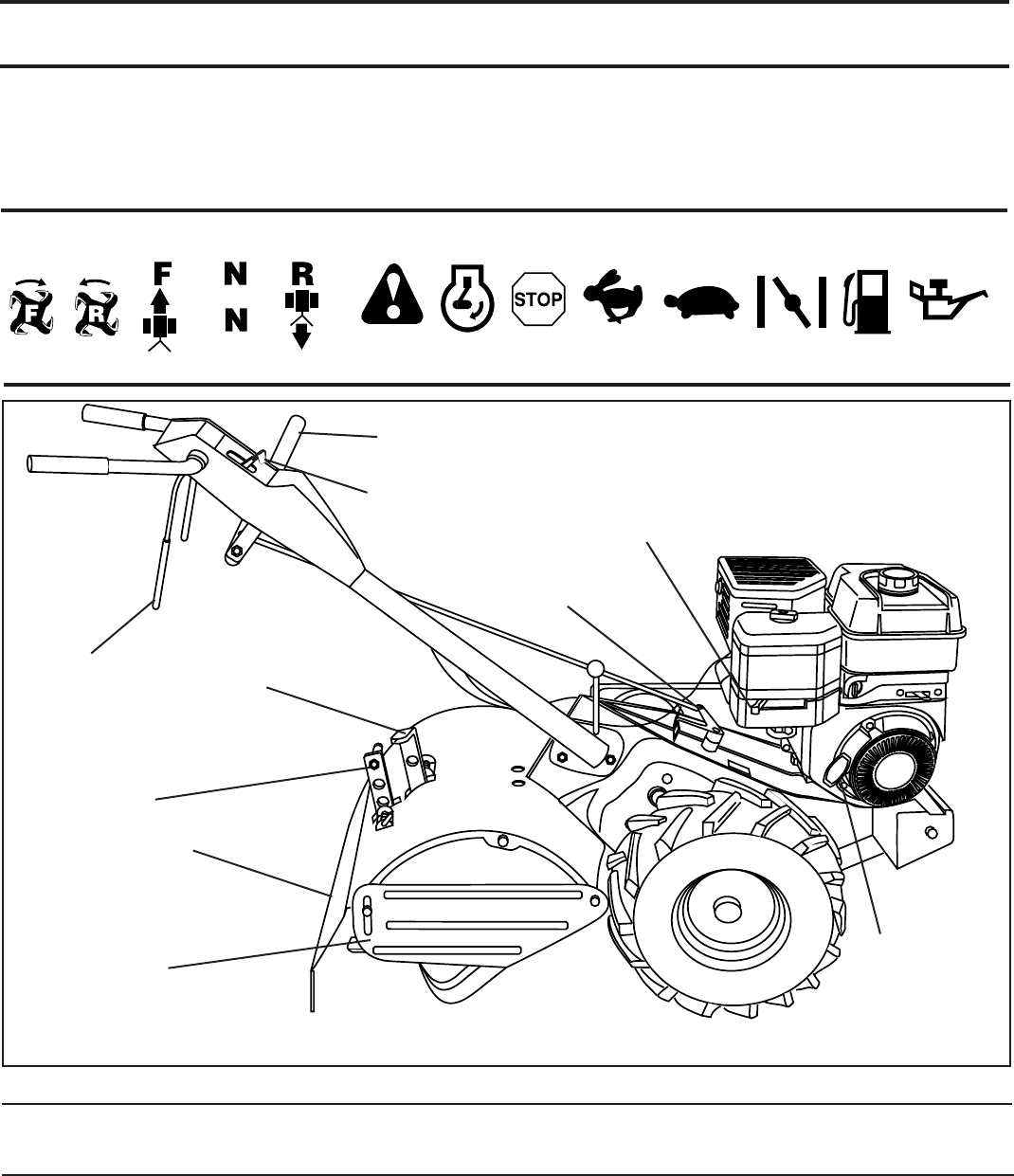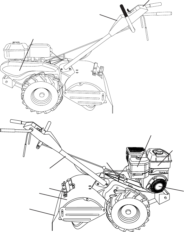 • Never operate the tiller without proper guards, plates,