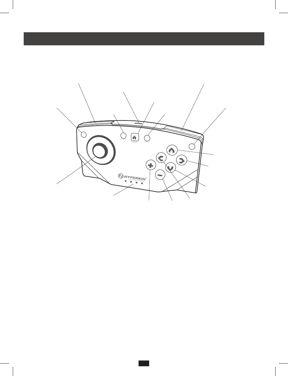o botão, 4 indicadores LED, dois botões macro, e um botão Home.