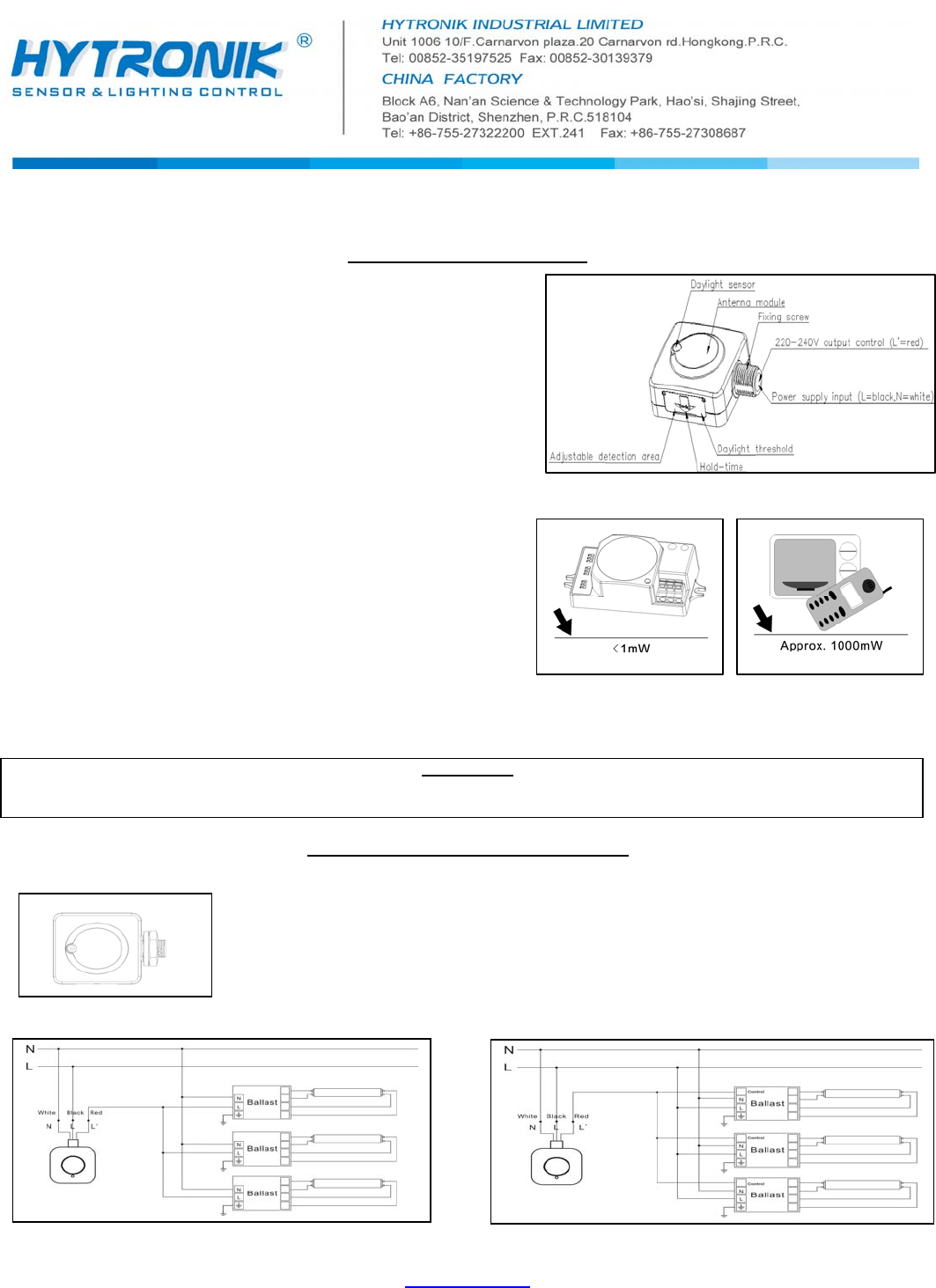 * While sensor use with Hytronik sensorDIM ballast or other dimming ballast, please keep the sensor antenna module from the ballast