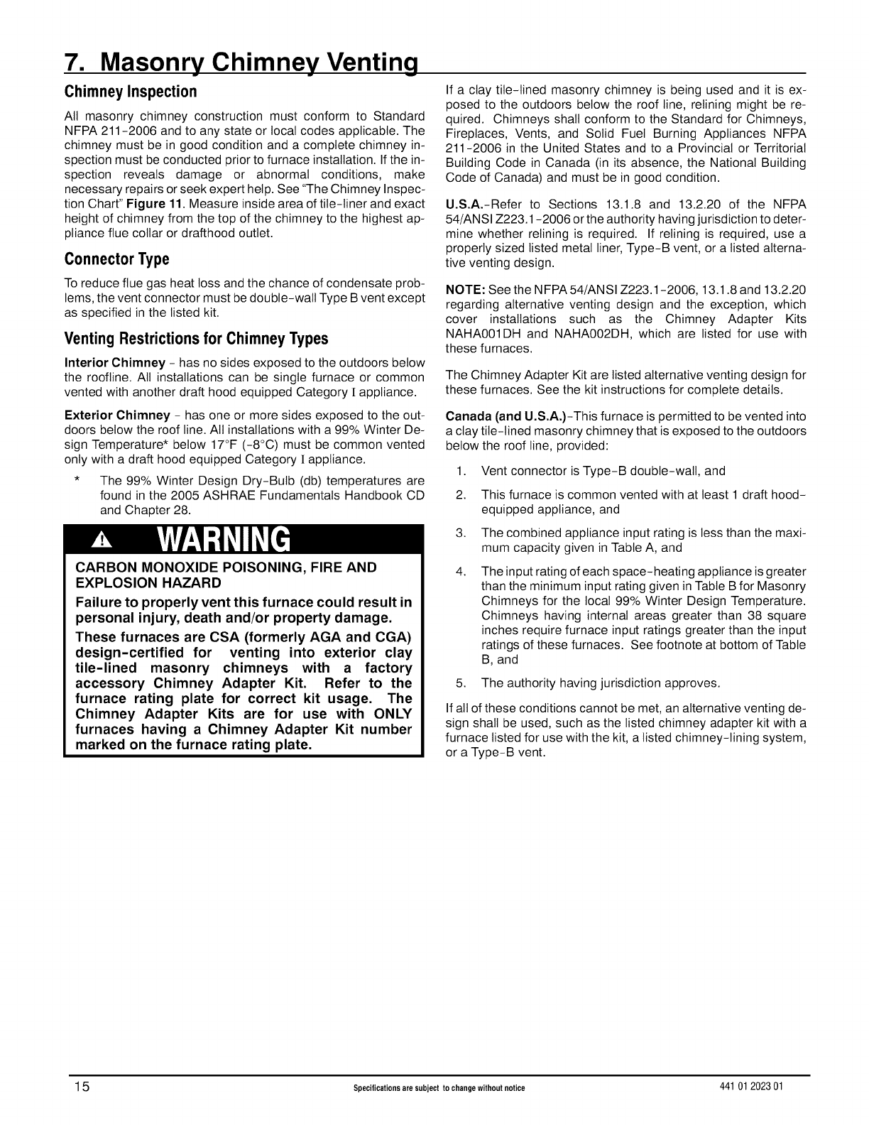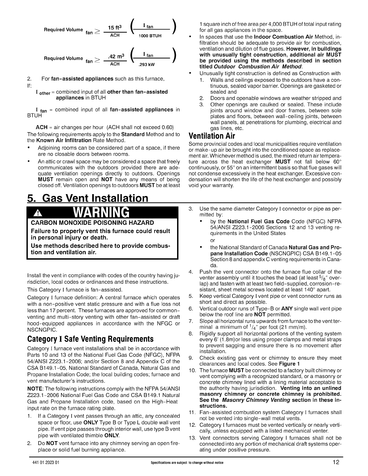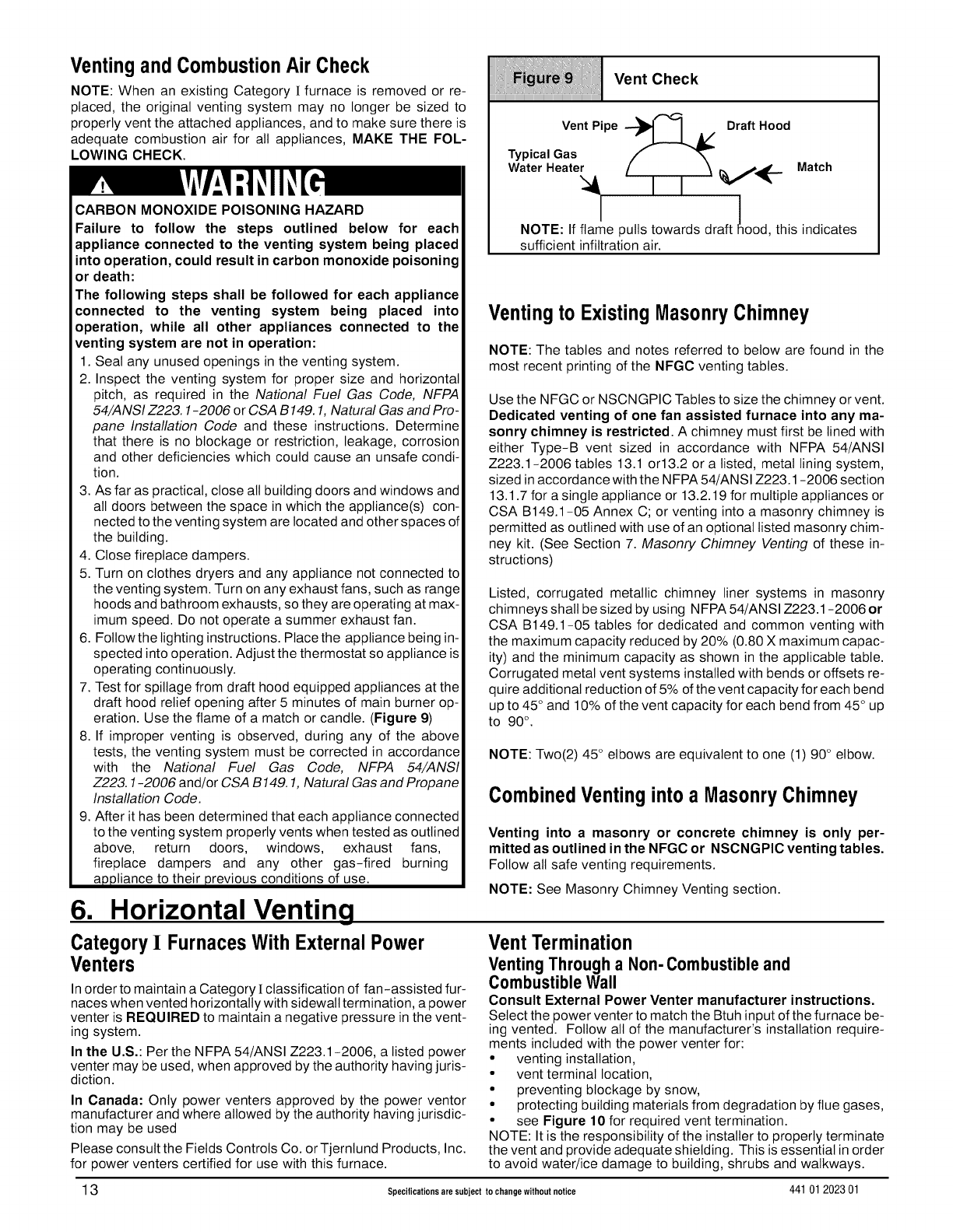 Code (NFCG) NFPA 54/ANSI Z223.1, and the National Electrical Code (NEC) NFPA 70.