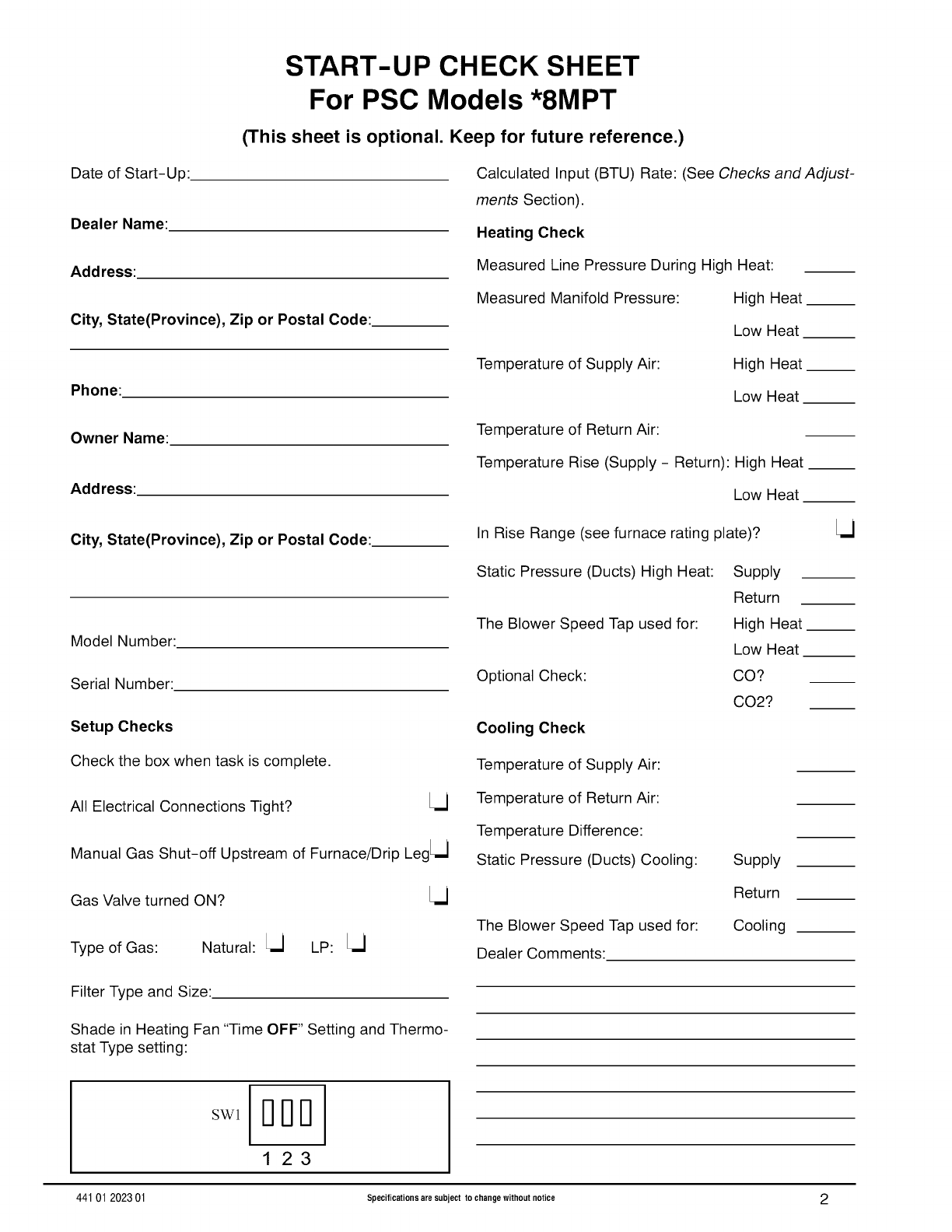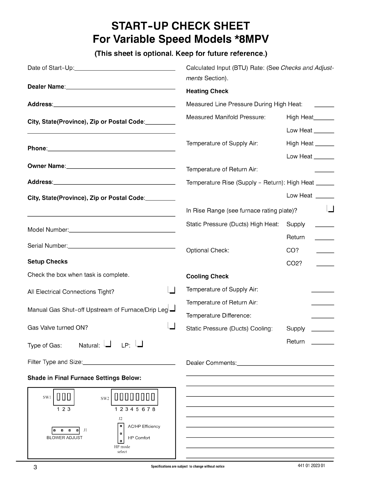 START-UP CHECK SHEET