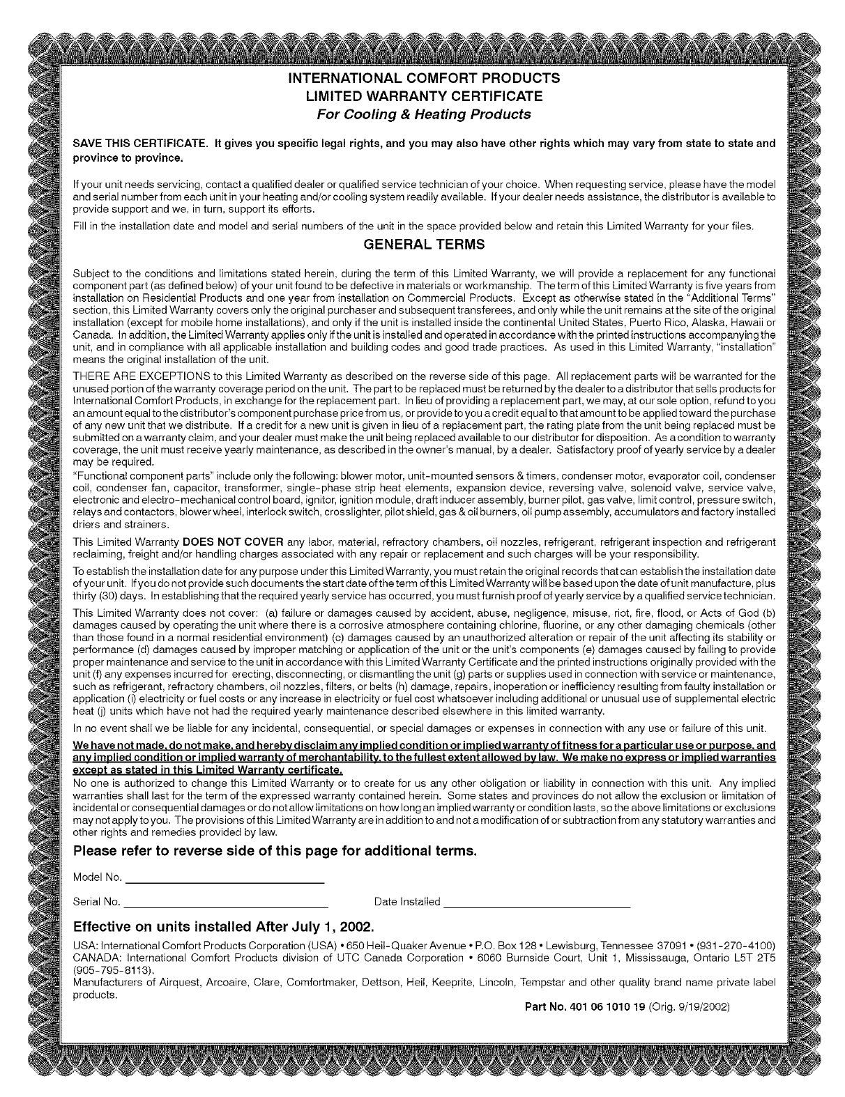 CANADA: International Comfort Products division of UTC Canada Corporation • 6060 Burnside Court, Unit 1, Mississauga, Ontario L5T 2T5