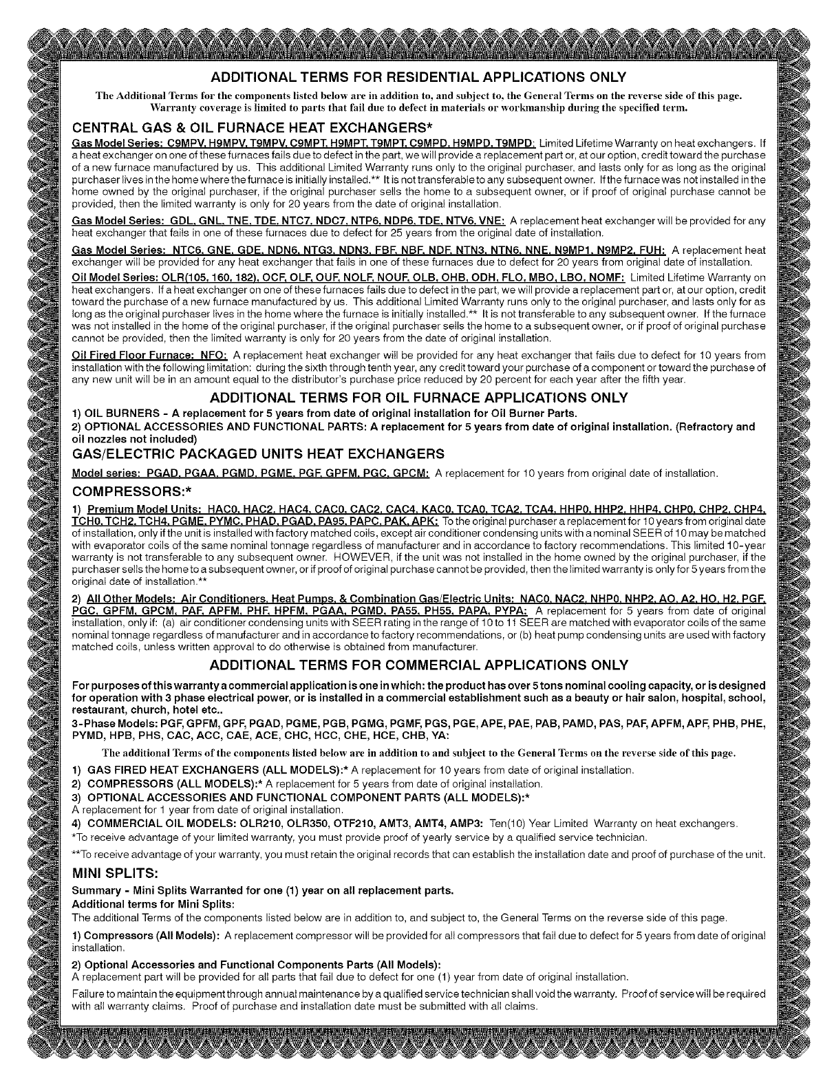 1) GAS FIRED HEAT EXCHANGERS (ALL MODELS):* A replacement for 10 years from date of originat installation.