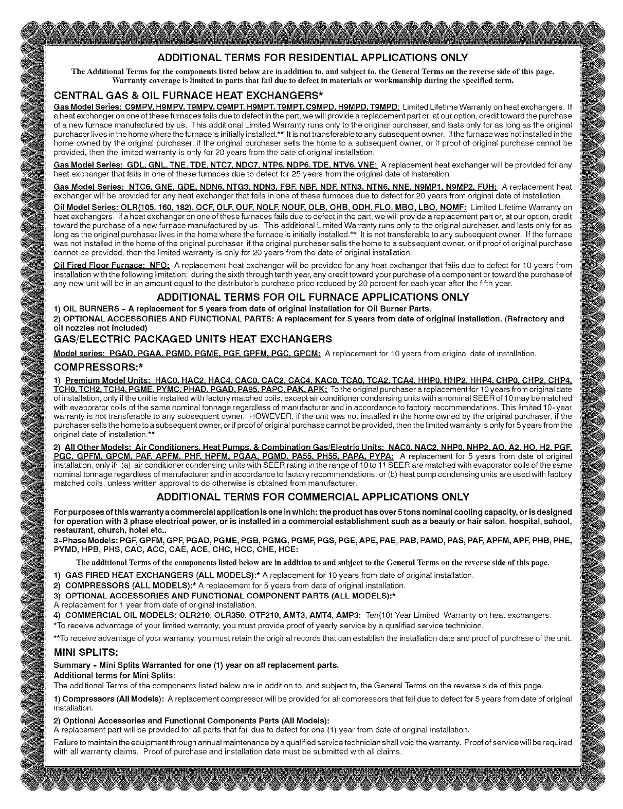 1) GAS FIRED HEAT EXCHANGERS (ALL MODELS):* A replacement for 10 years from date of originat installation.