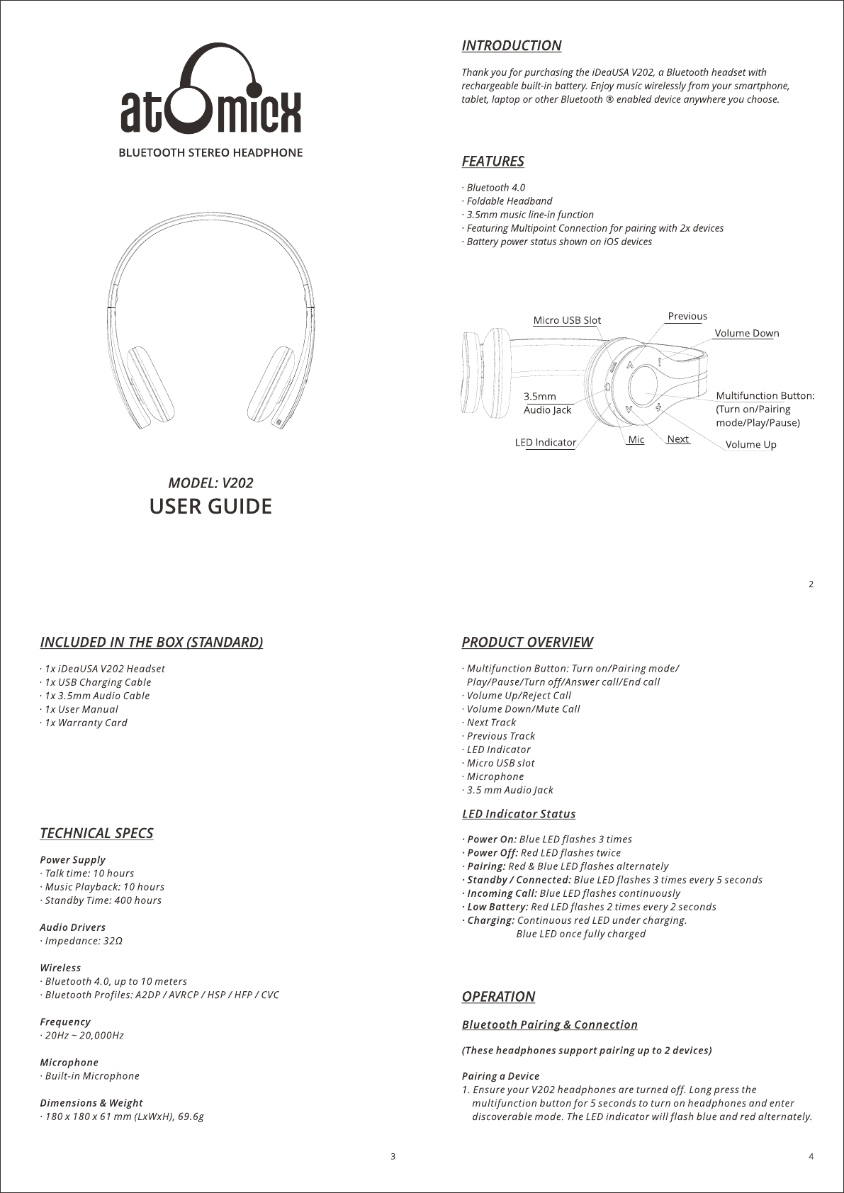 IDEA ELECTRONICS 16V-01 Bluetooth Headphones User Manual 1