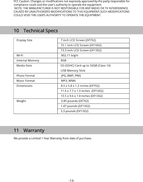IDEA ELECTRONICS 18IDF10-01 Digital Photo Frame User Manual iDeaPlay Digital Photo Frame 20180329