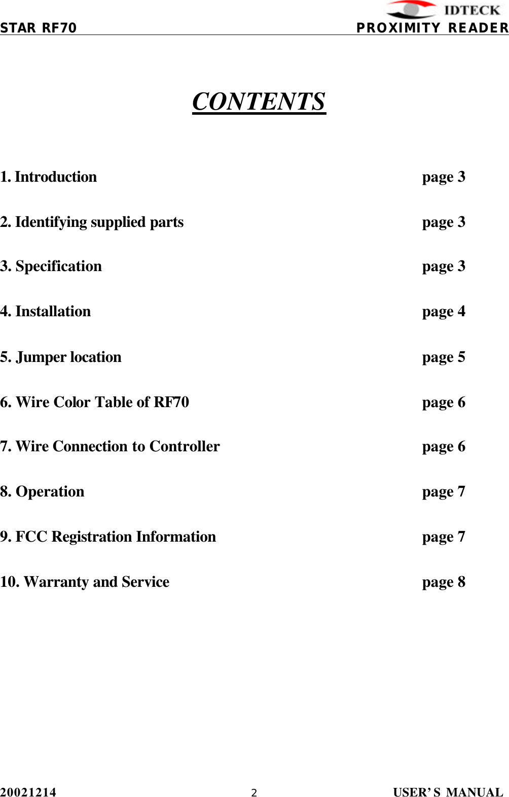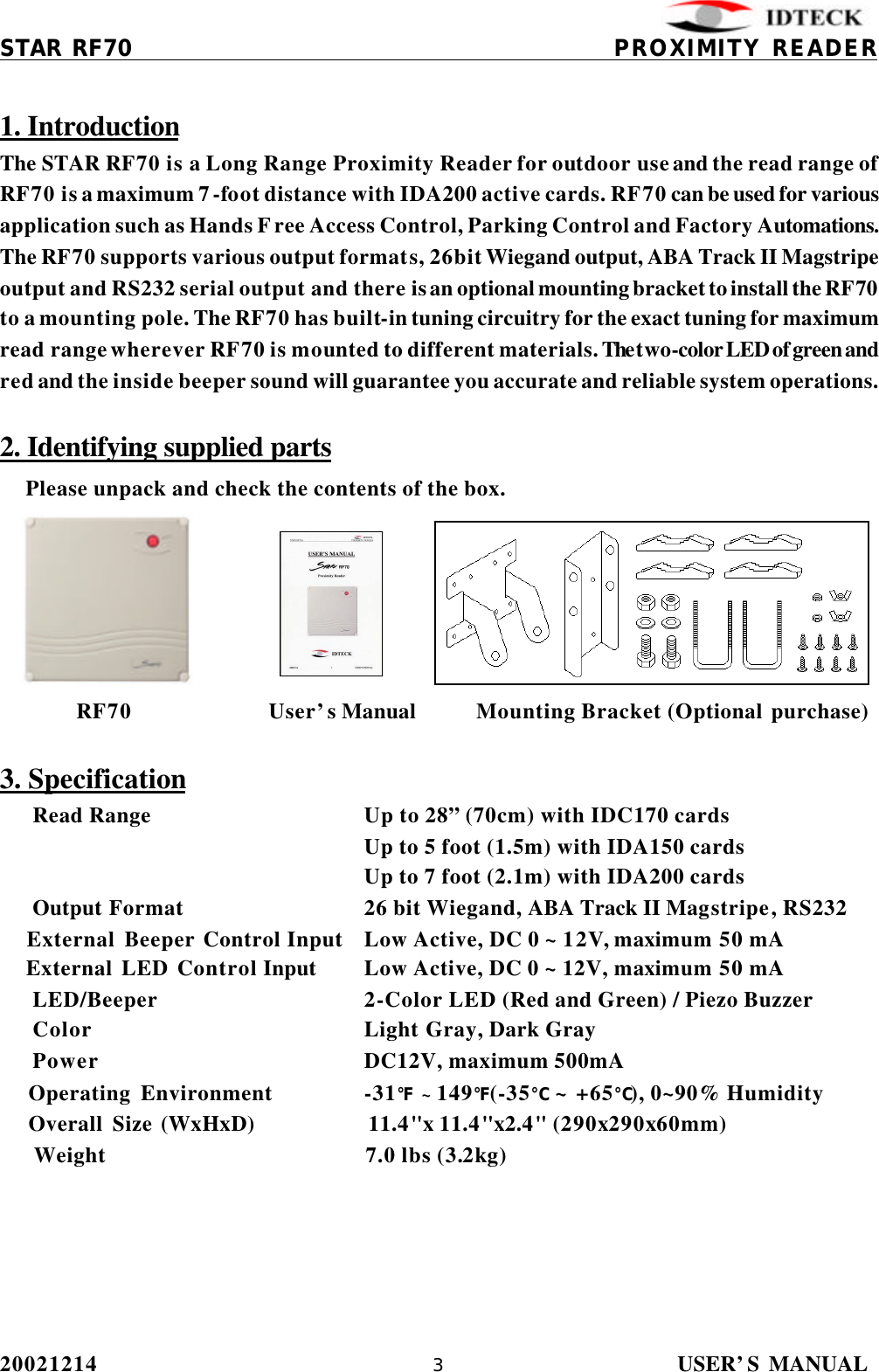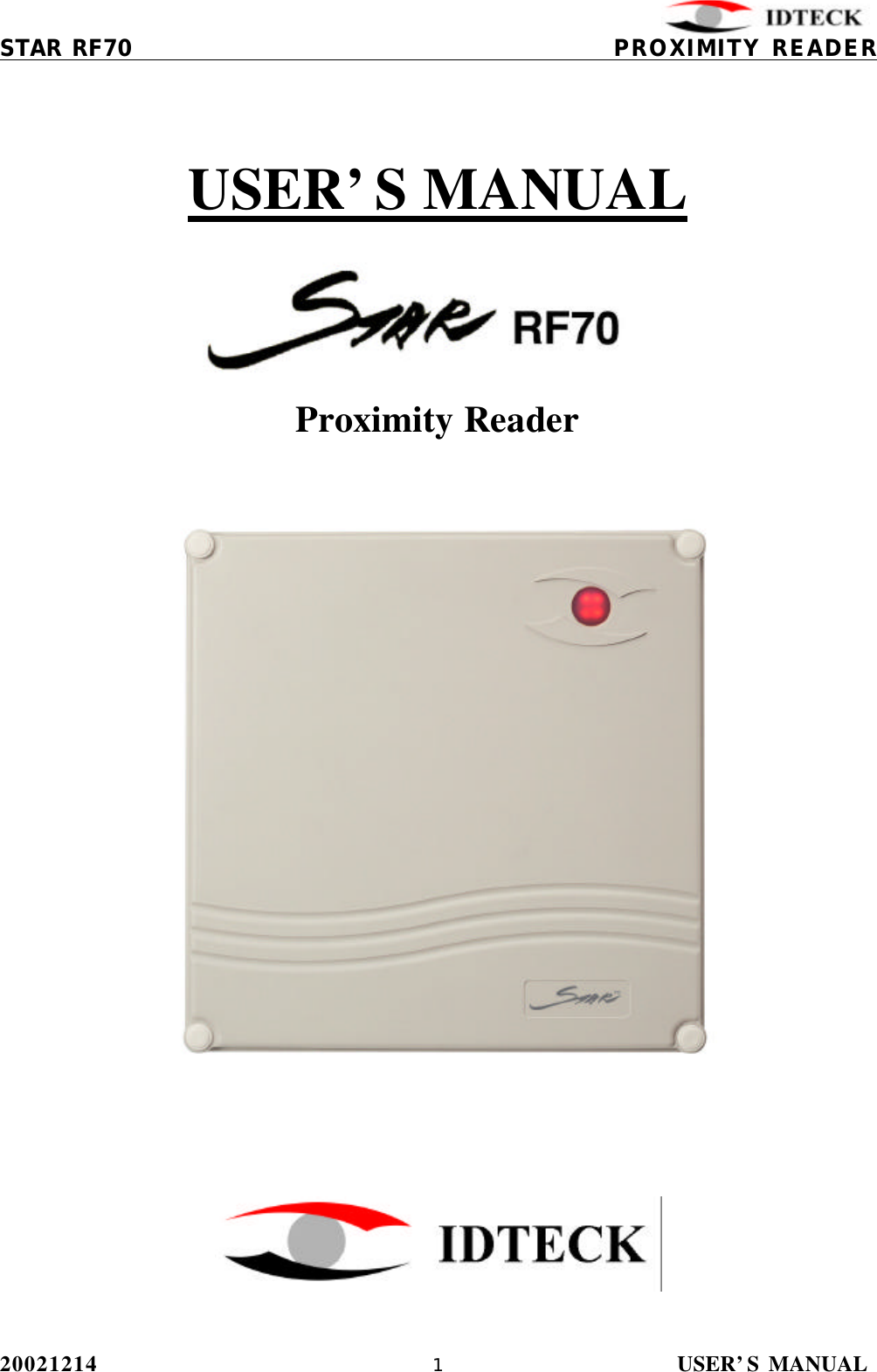 IDTECK STARRF70 Proximity Reader User Manual RF70 English