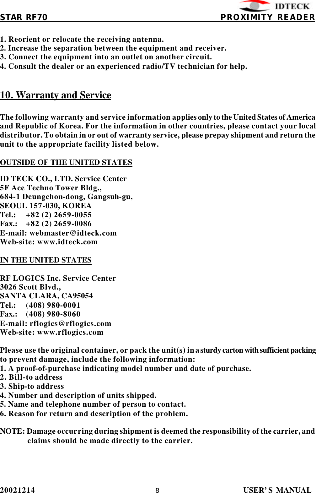 ID-Teck Co Ltd Proximity Reader RF70 English