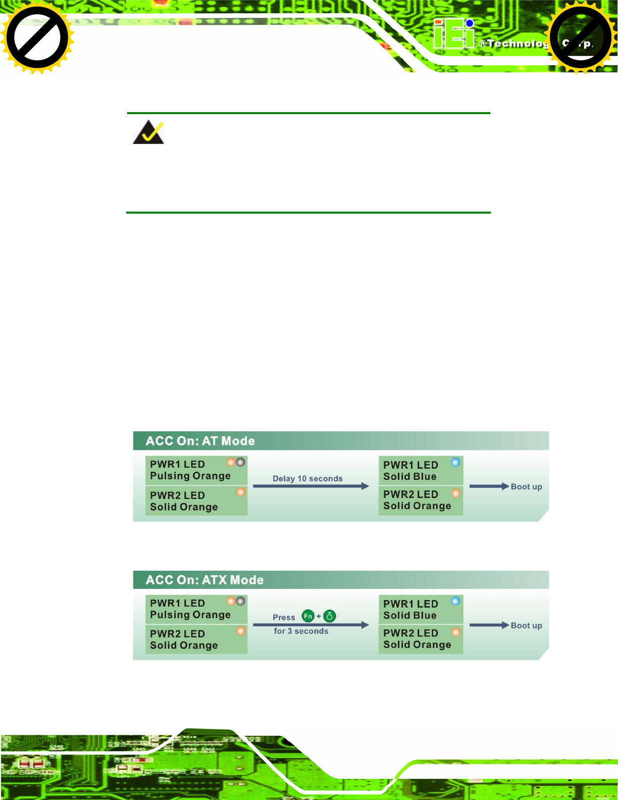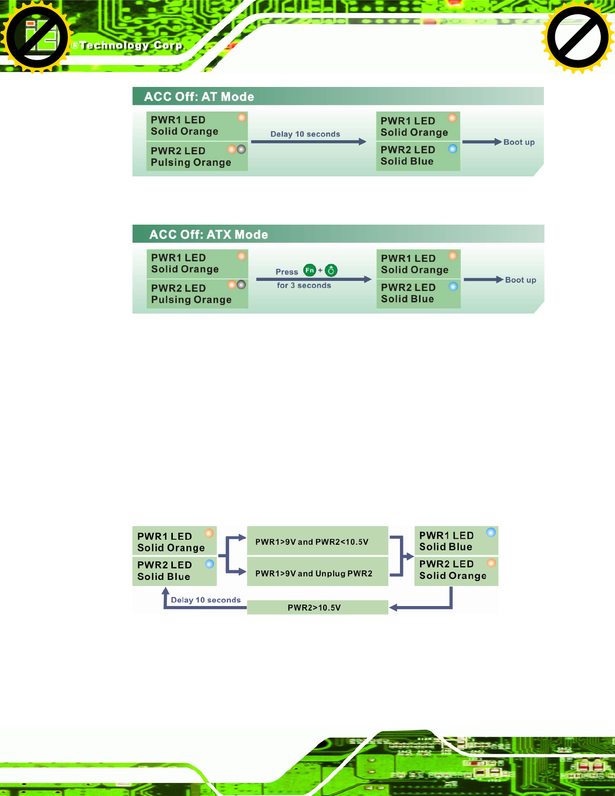 The following flow diagrams show the boot-up process and the LED status in AT and ATX