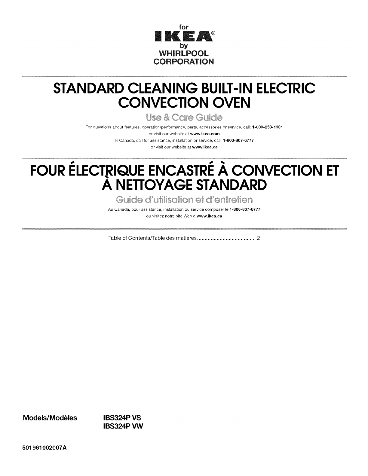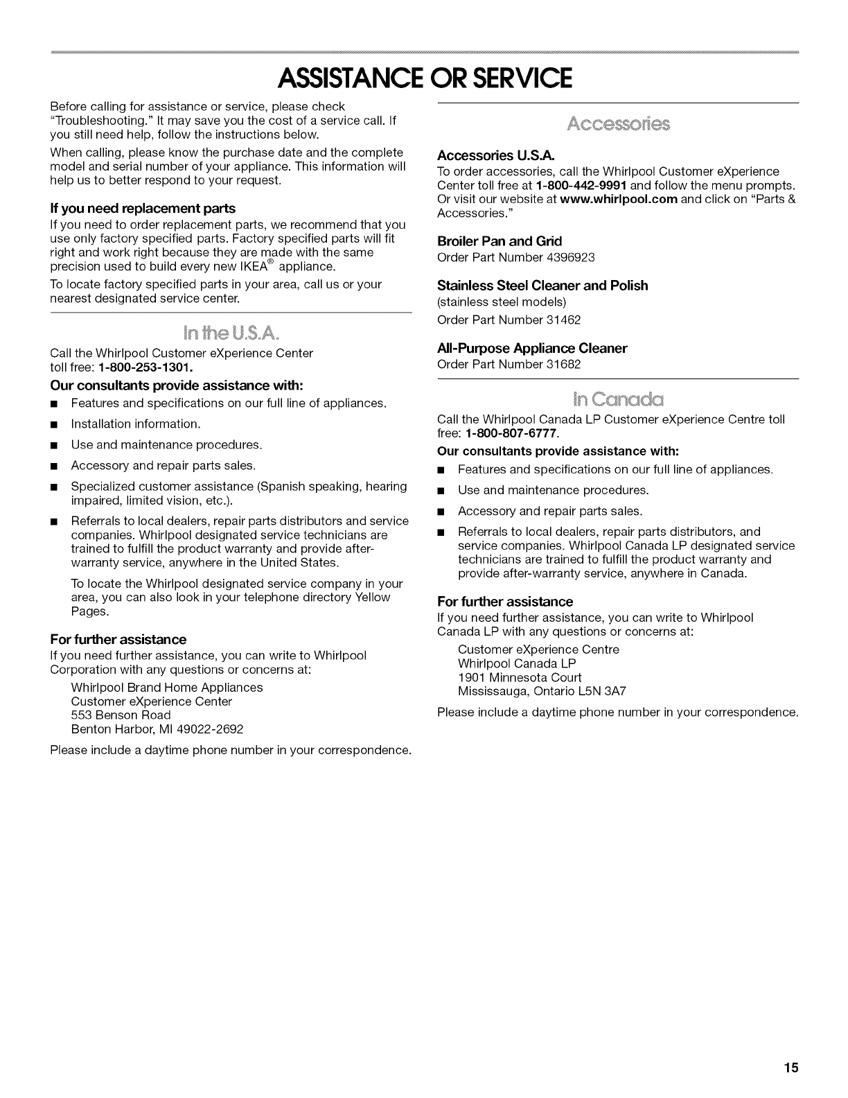 For questions about features, operation/performance, parts, accessories or service, call: 1-800-253-1301