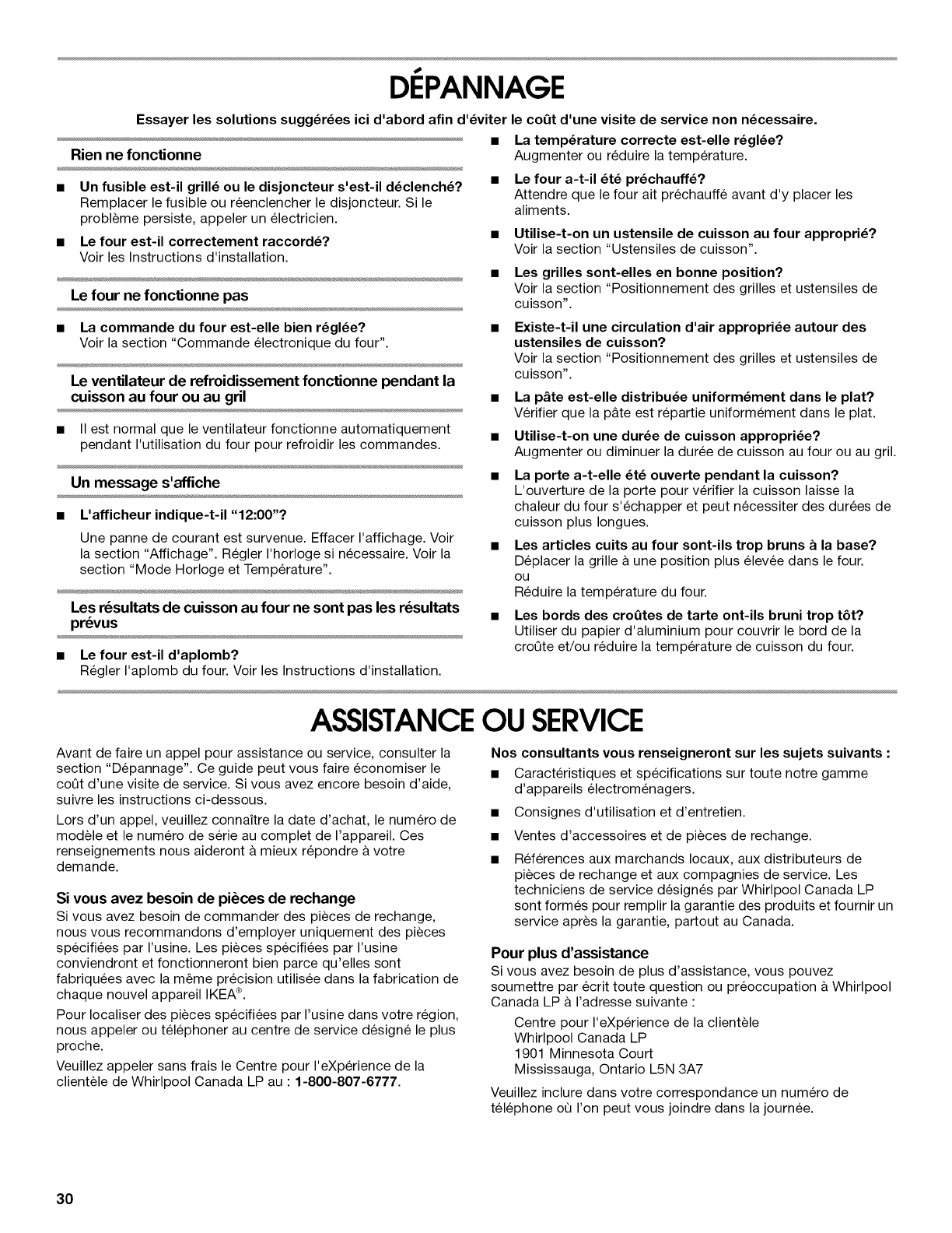 "Depannage", de I'aide supplementaire peut etre trouvee en verifiant la section "Assistance ou service" ou en appelant Whirlpool. Aux
