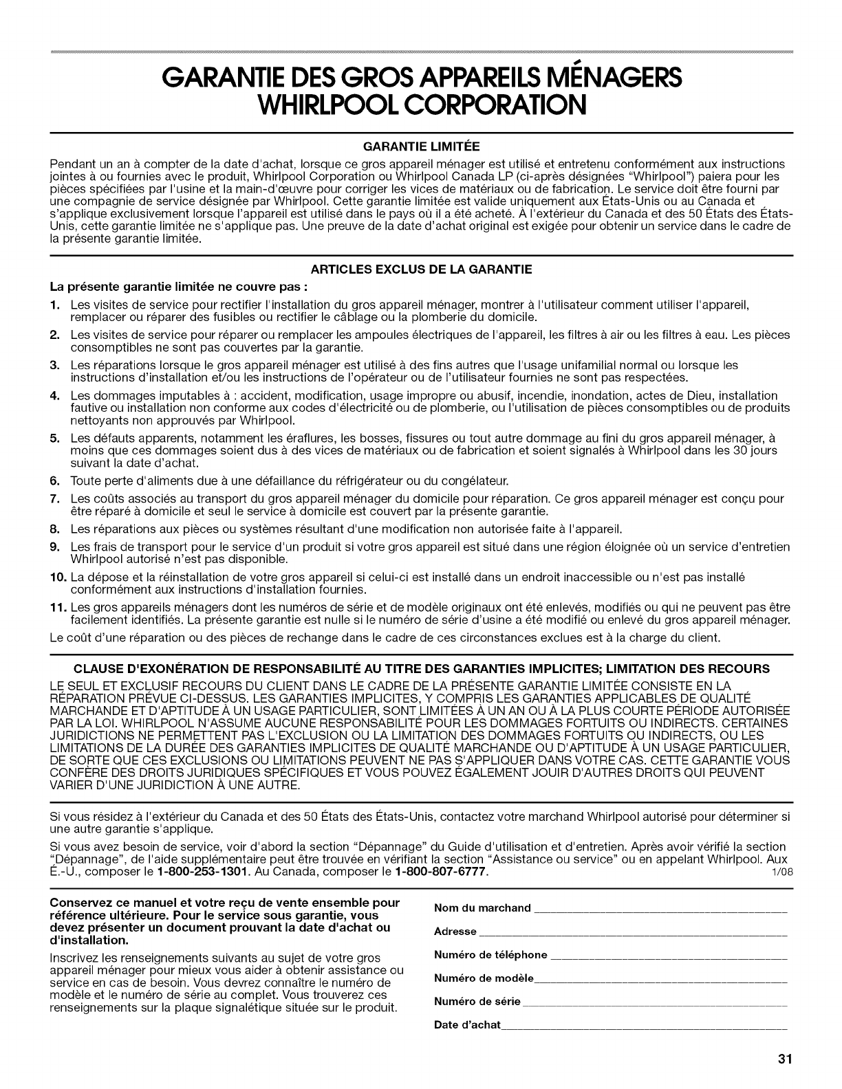 PAR LA LOI. WHIRLPOOL N'ASSUME AUCUNE RESPONSABILITI 2 POUR LES DOMMAGES FORTUITS OU INDIRECTS. CERTAINES