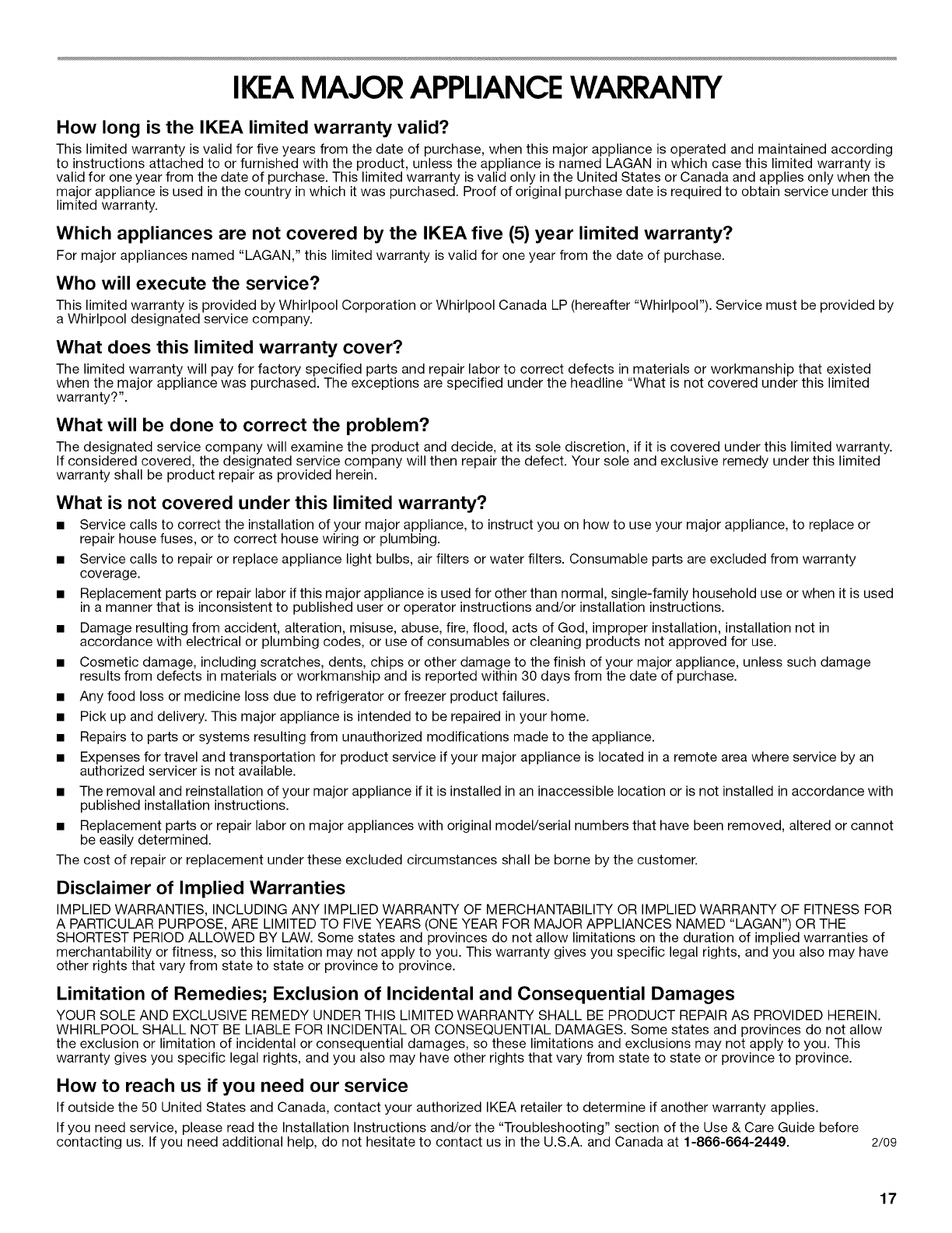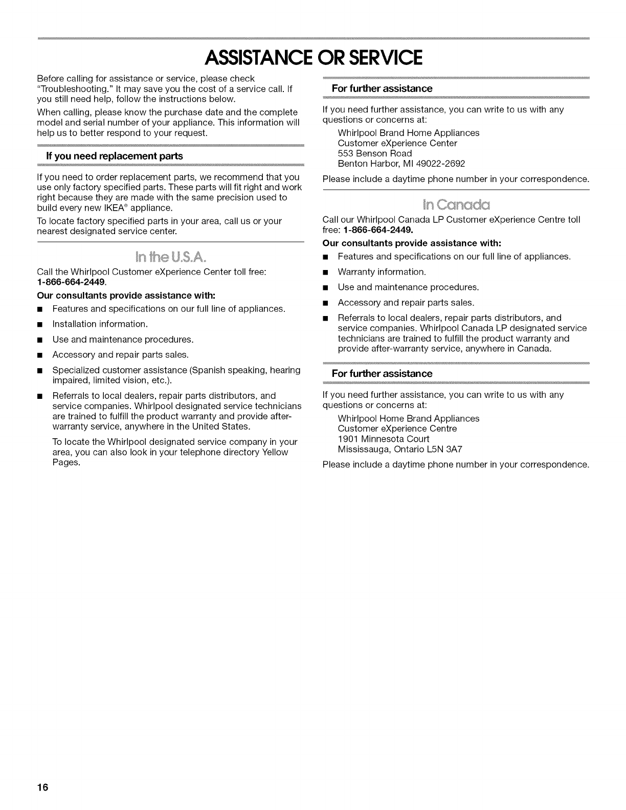 In Canada, for assistance, installation or service, call: 1-866-664-2449.