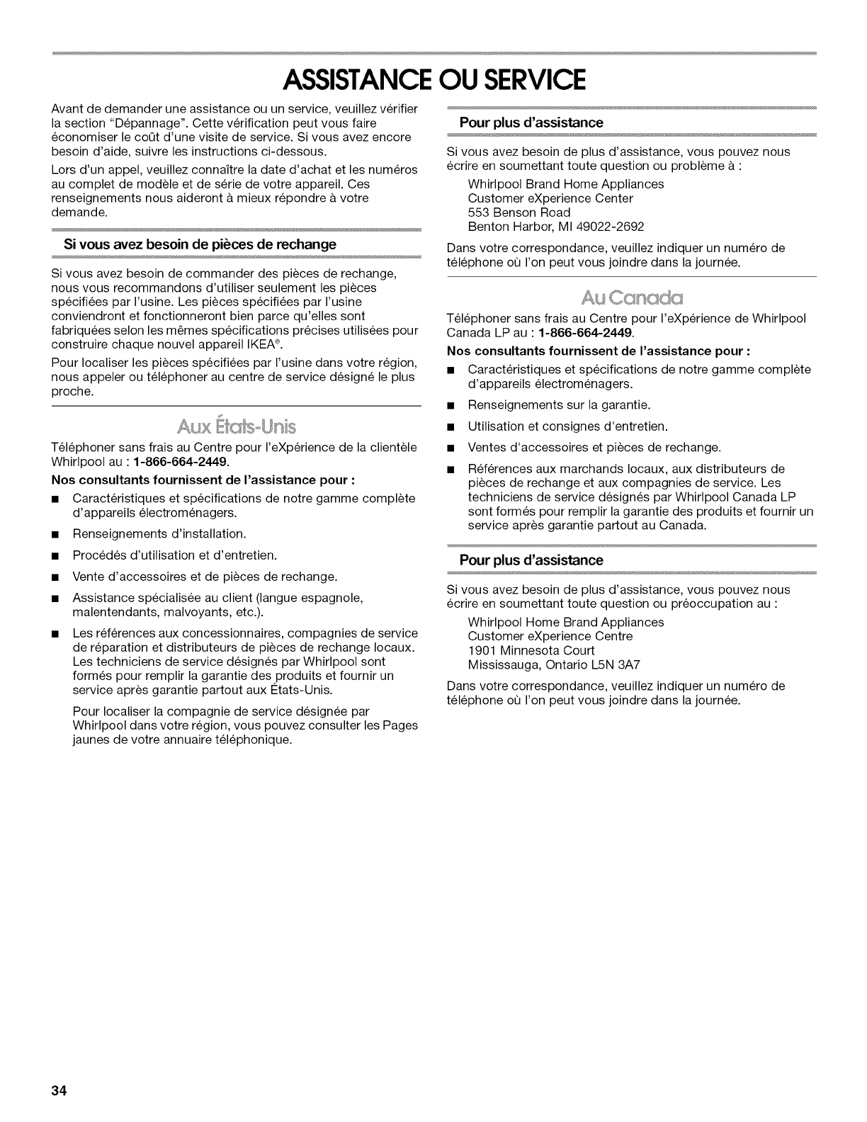 Au Canada, pour assistance, installation ou service, composez le 1-866-664-2449.