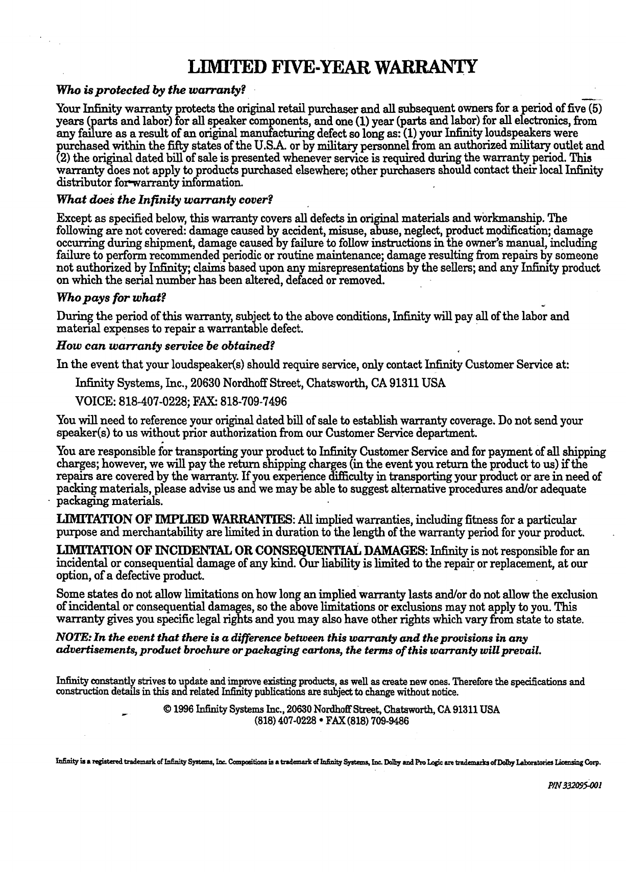 In the event that your loudspeaker(s) should require service, only contact Infinity Customer Service at: