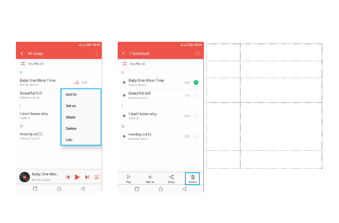 enter Music library, then touch and hold an artist, a song, or an album, some options will be available to
