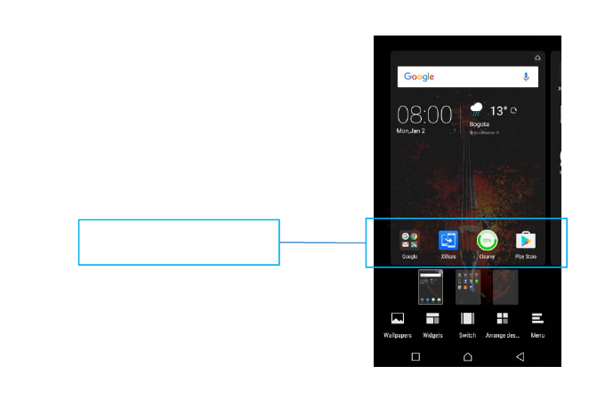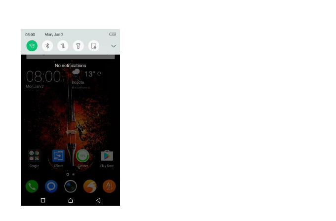 Power on status, press and hold to enter phone options (Power off, Reboot, Airplane mode, and