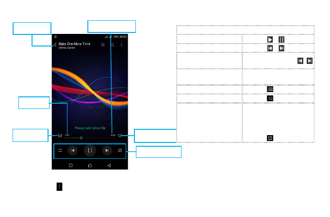 Open special functions or additional options. Try it: From Application menu, touch Music