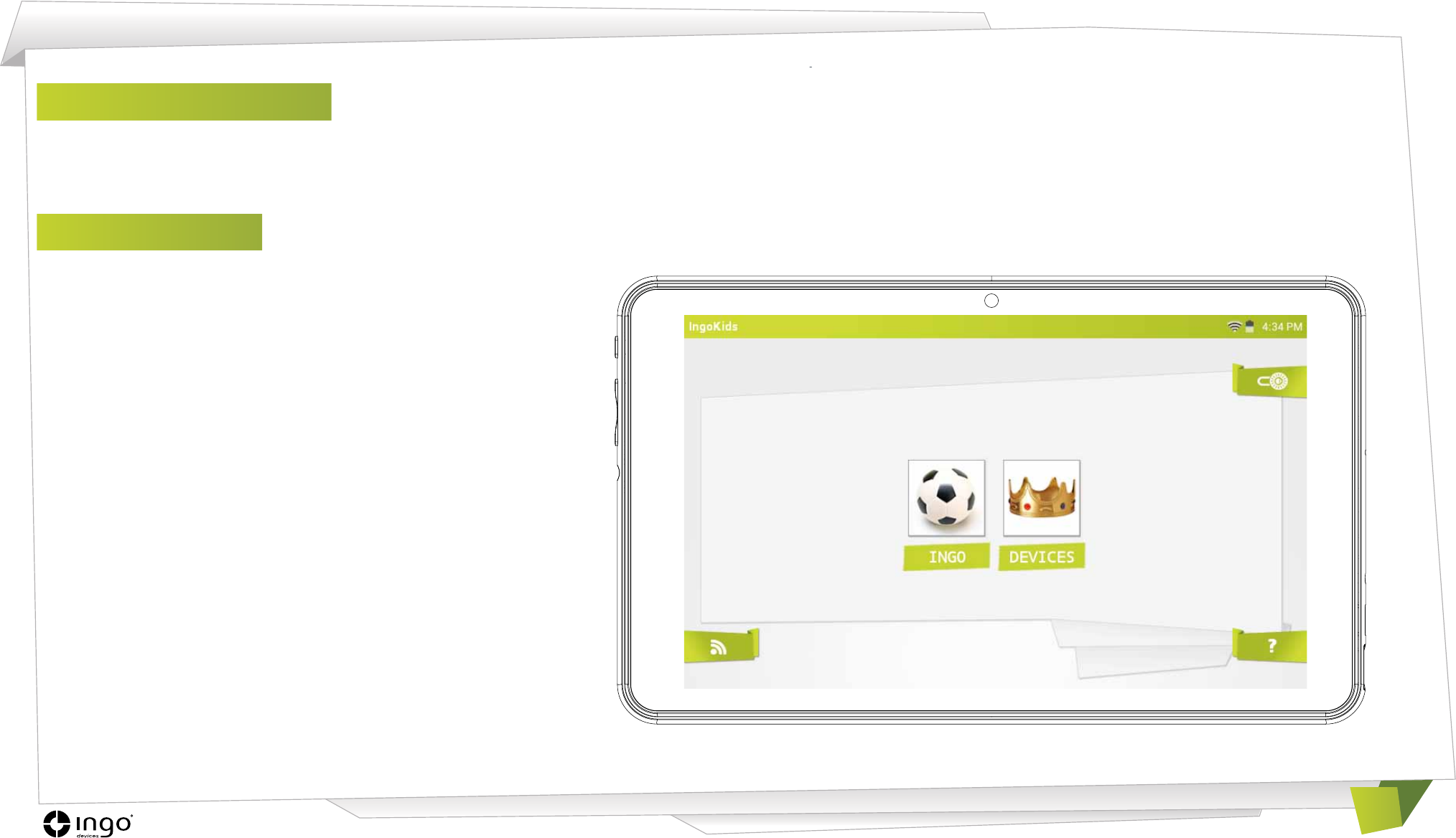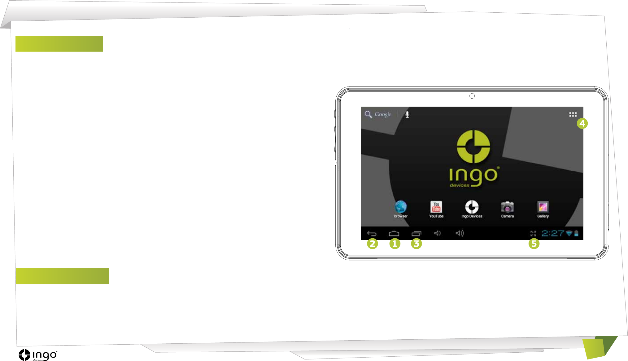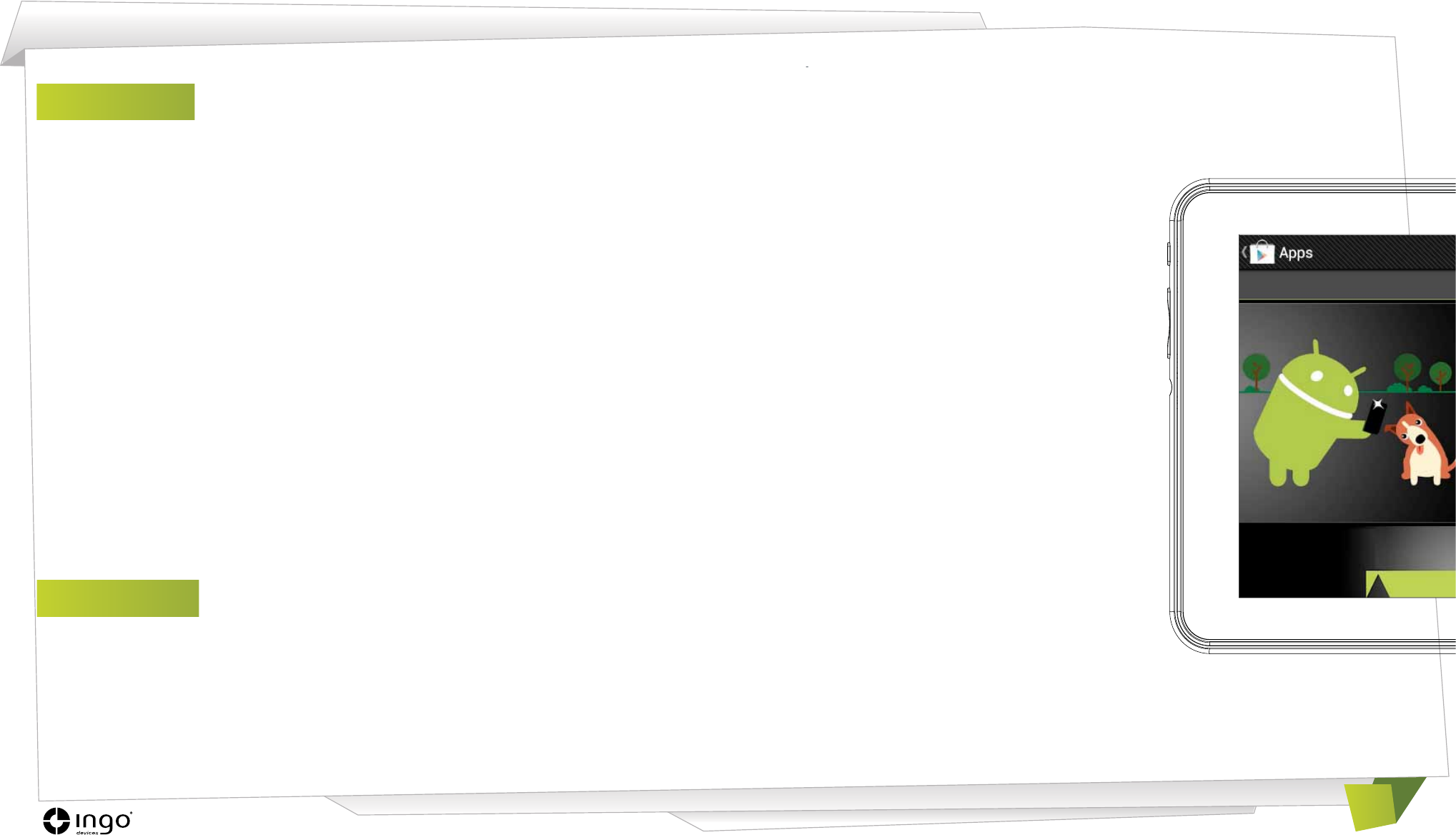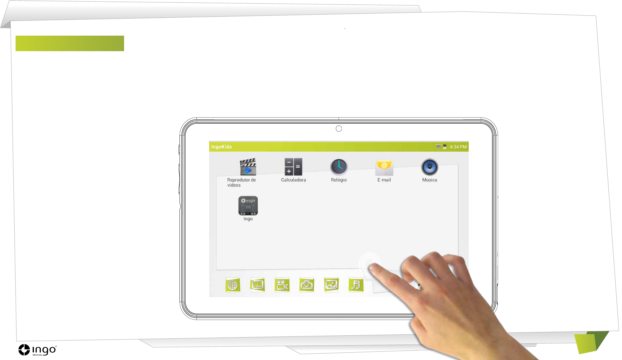 The Ingo tablet has a multi touch capacitive screen. You only need your ngers to control it. Touch the screen to open applications, videos and les.