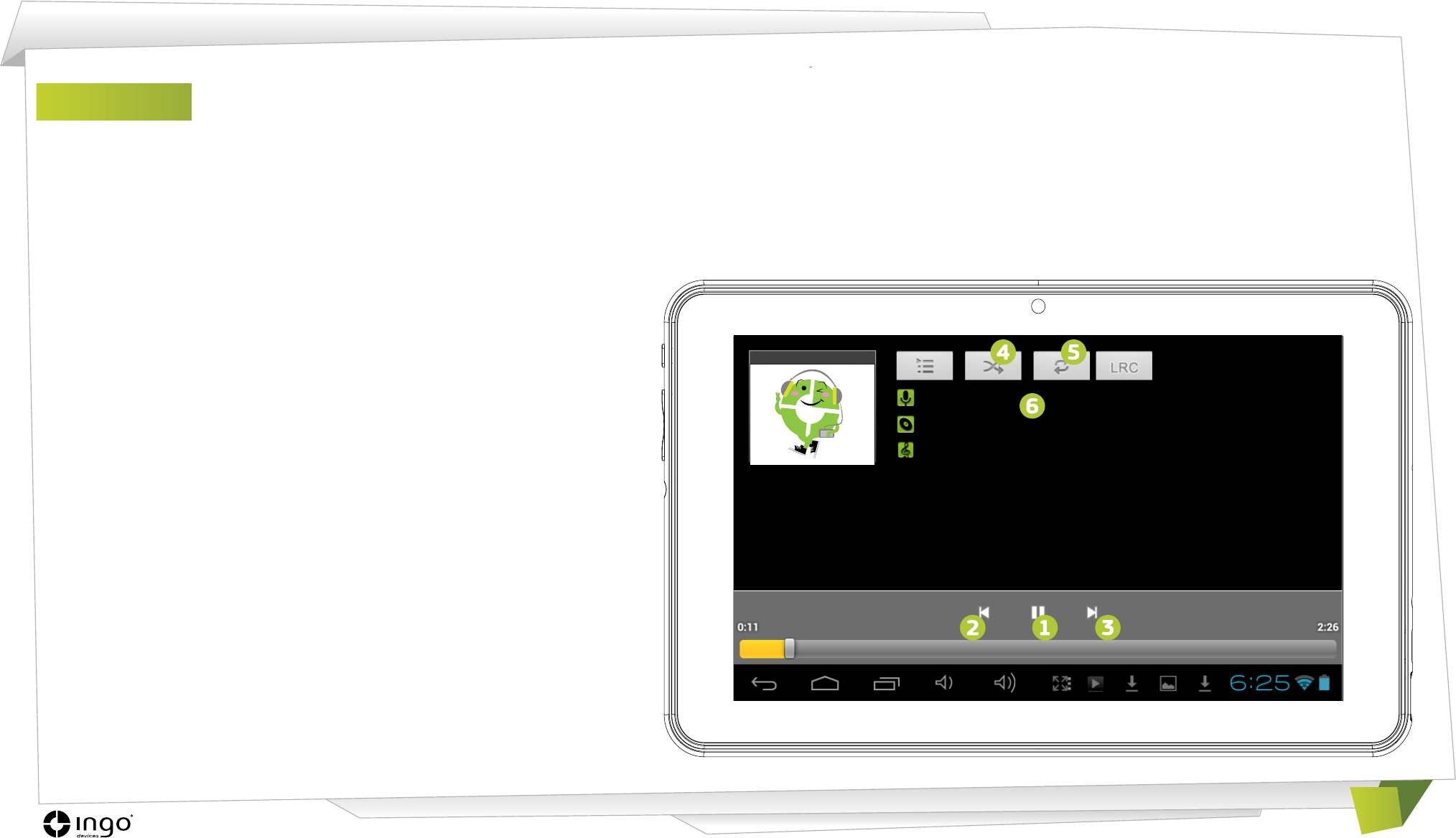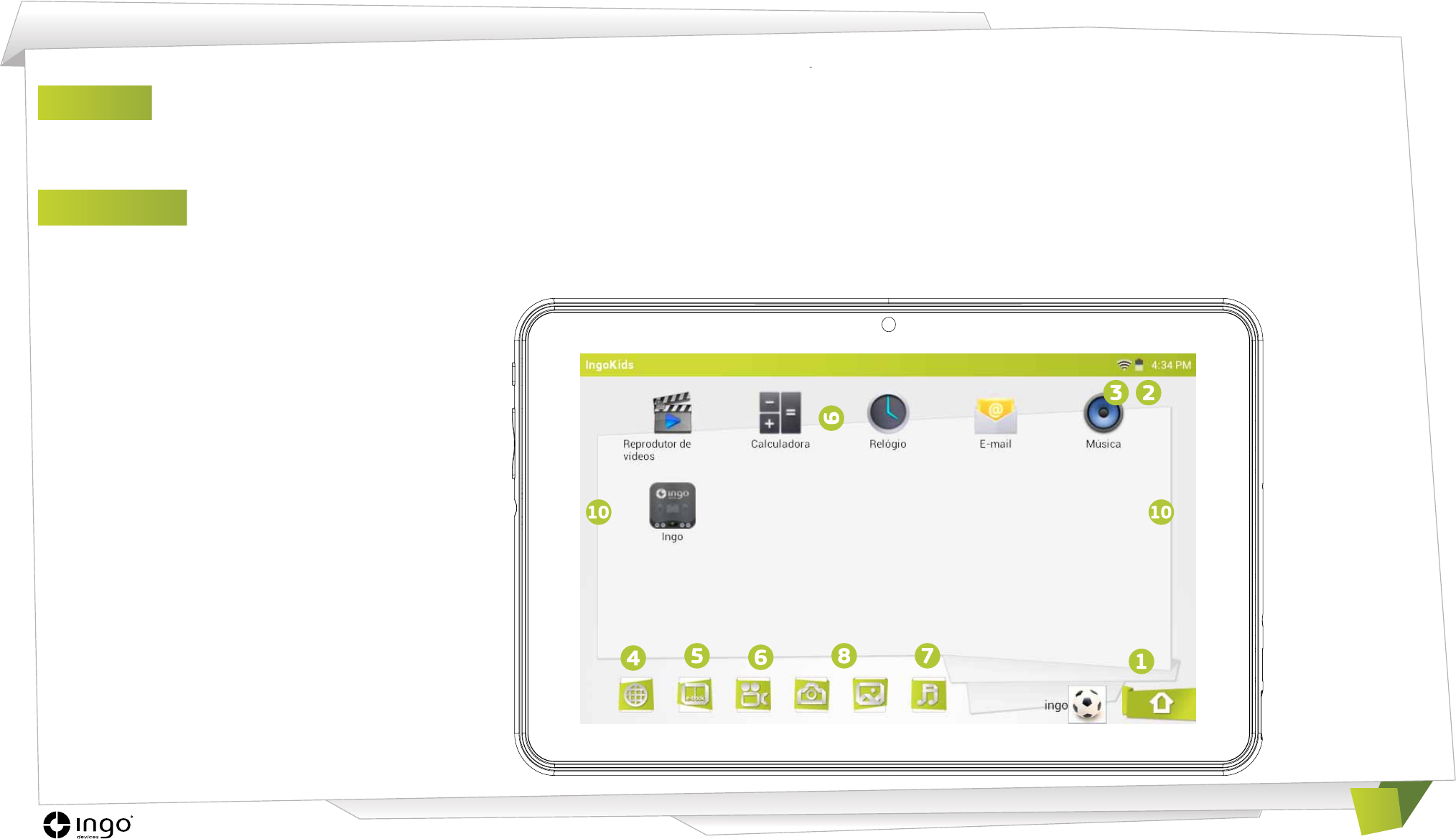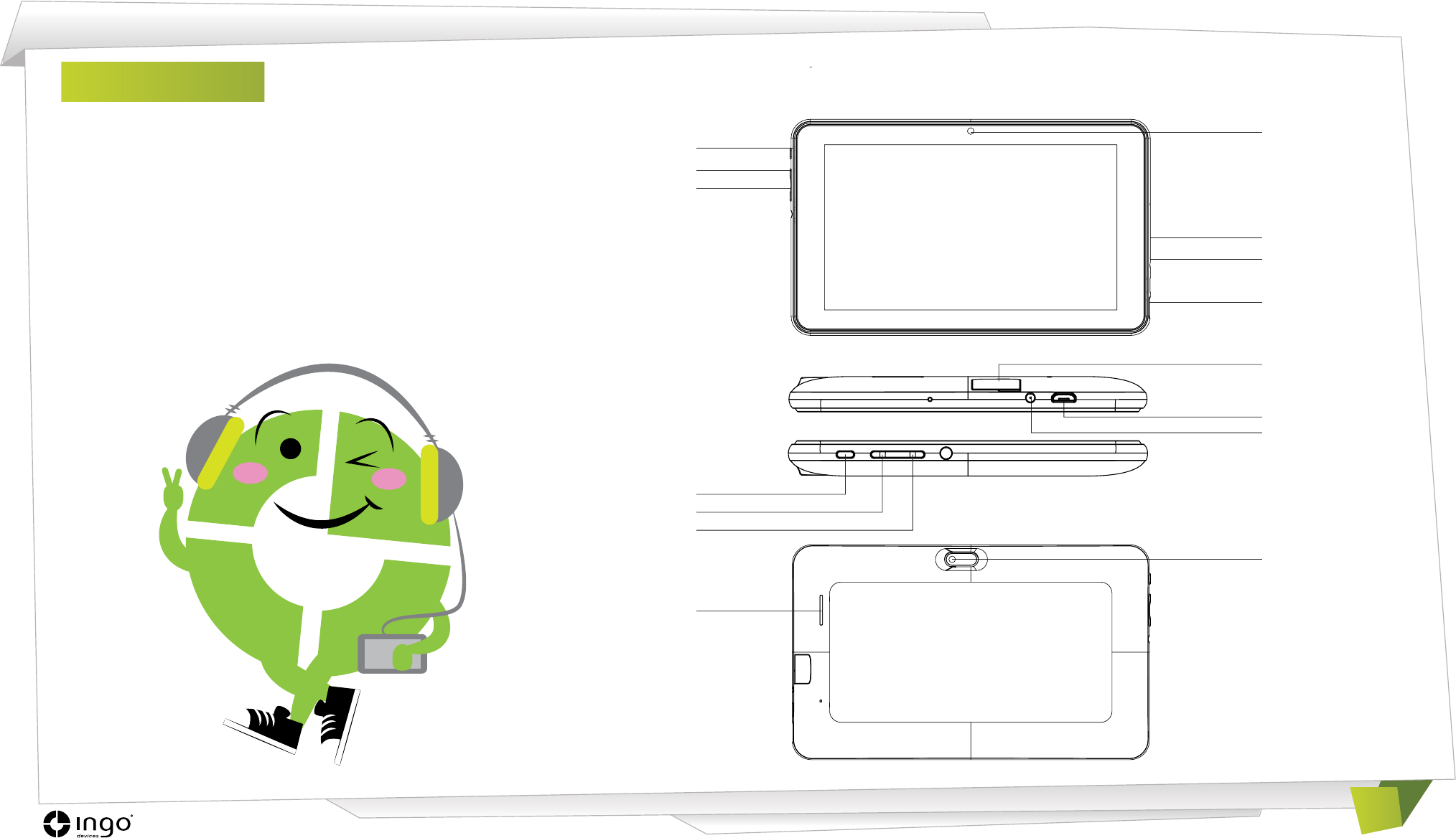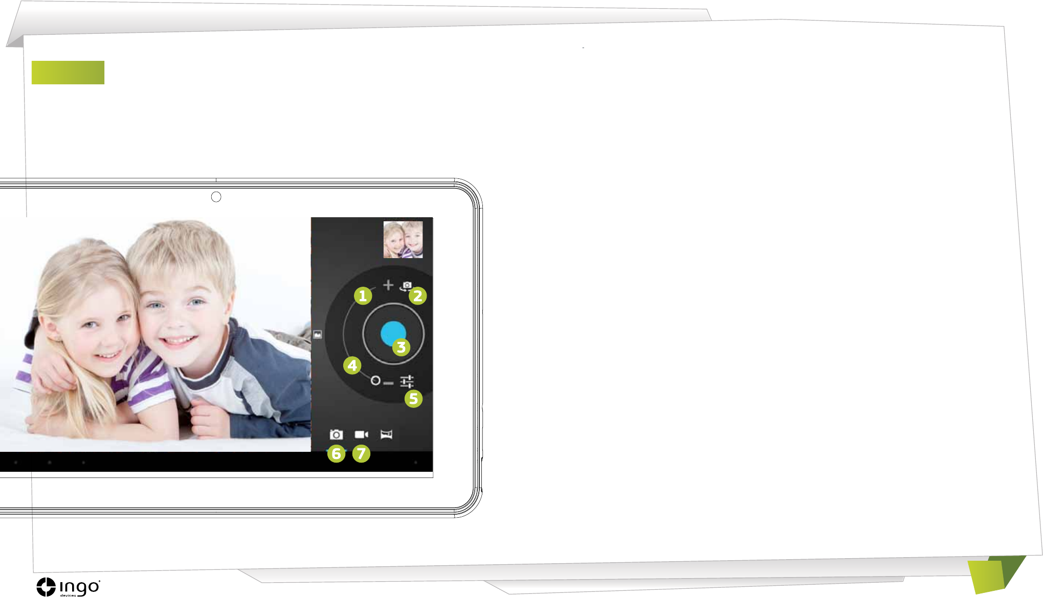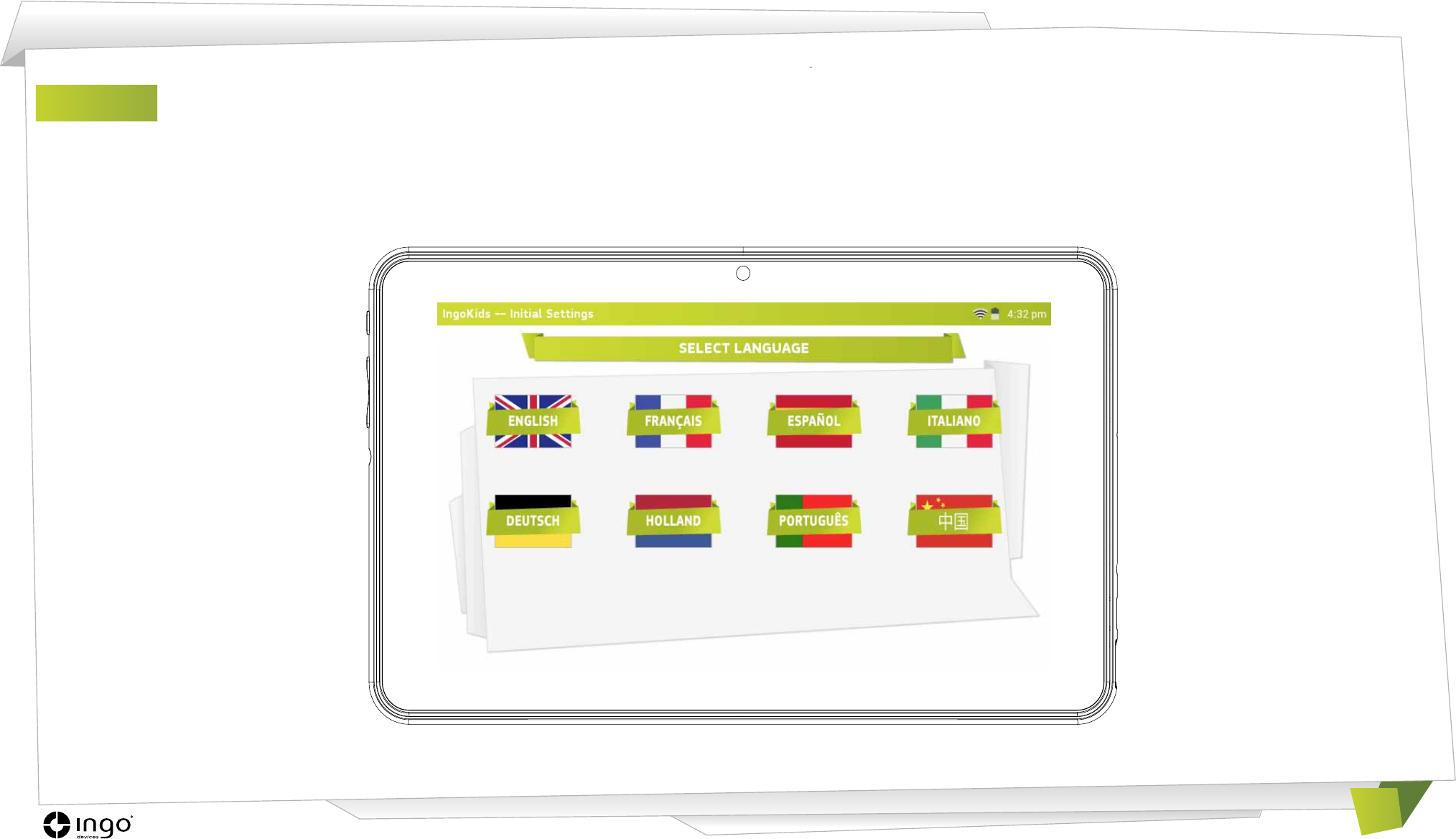 The Ingo tablet has a multi touch capacitive screen. You only need your ngers to control it. Touch the screen to open applications, videos and les.