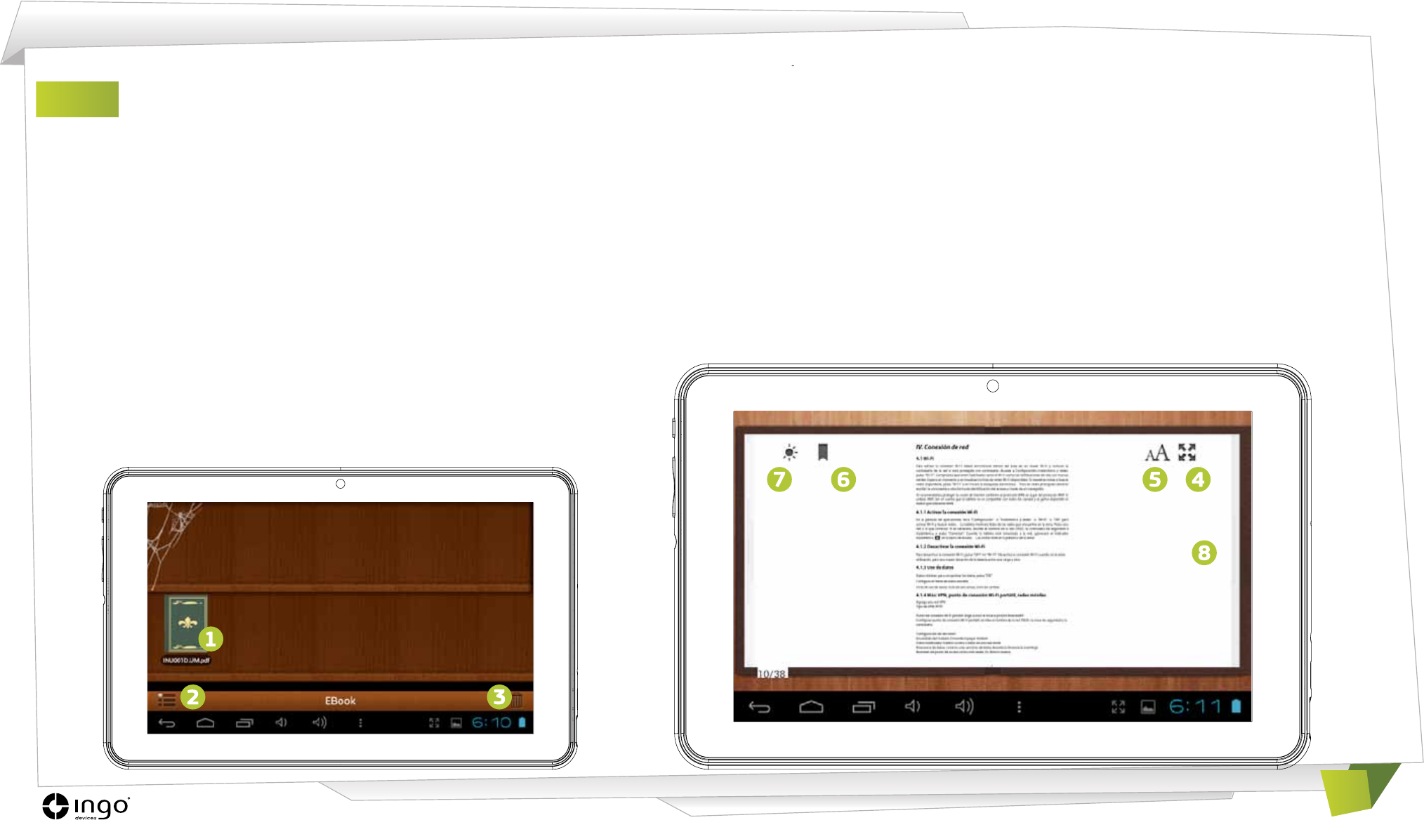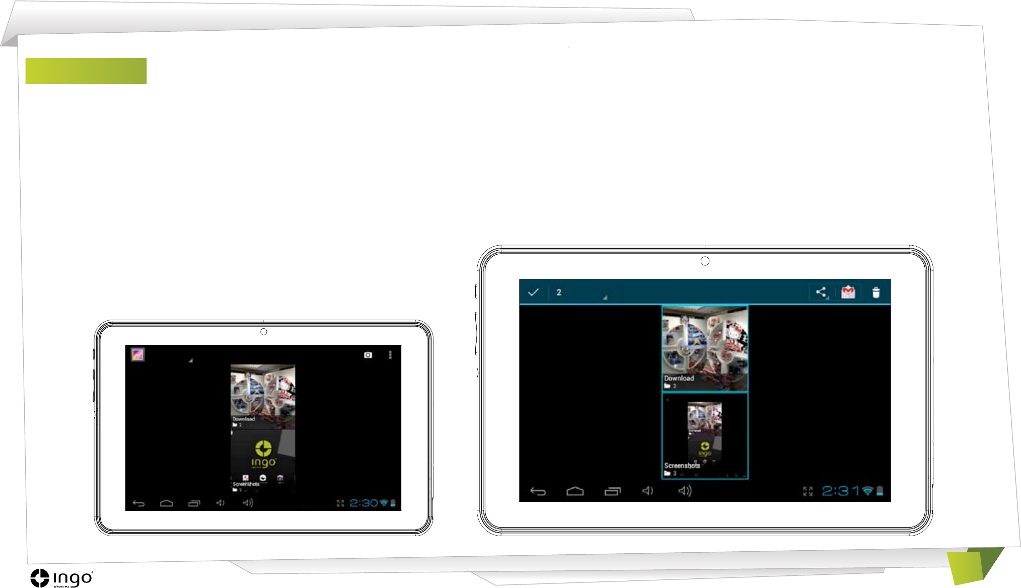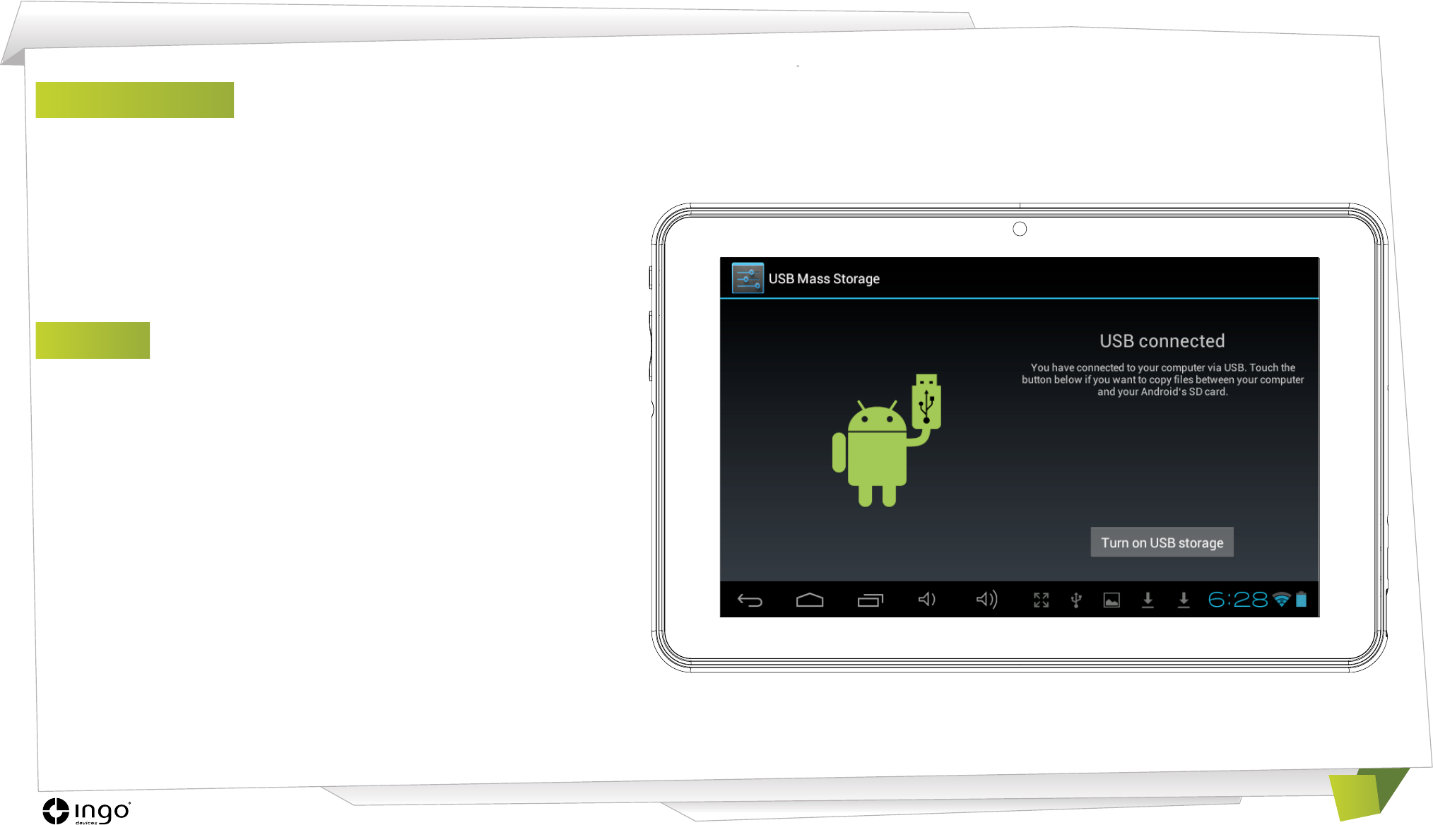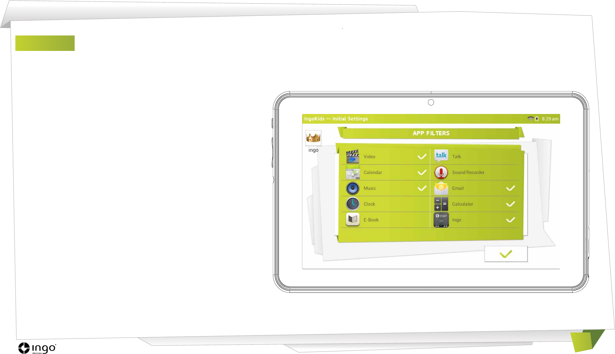 The Ingo tablet has a multi touch capacitive screen. You only need your ngers to control it. Touch the screen to open applications, videos and les.
