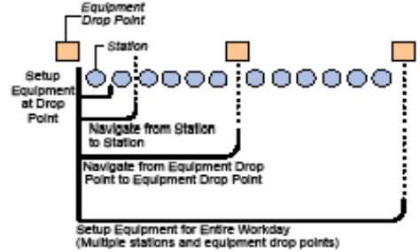 • Navigate from station to station, with an equipment drop point at specified intervals