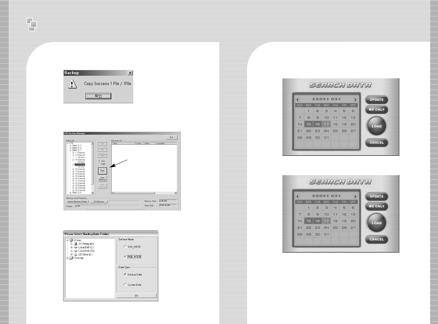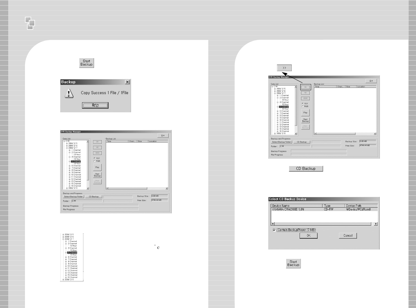 11 )) Backup Manager illustrates recorded data by date, channel and time.