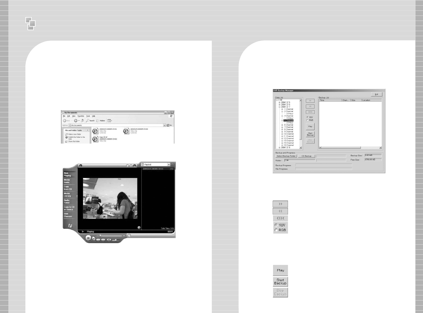 11 )) Backup Manager illustrates recorded data by date, channel and time.