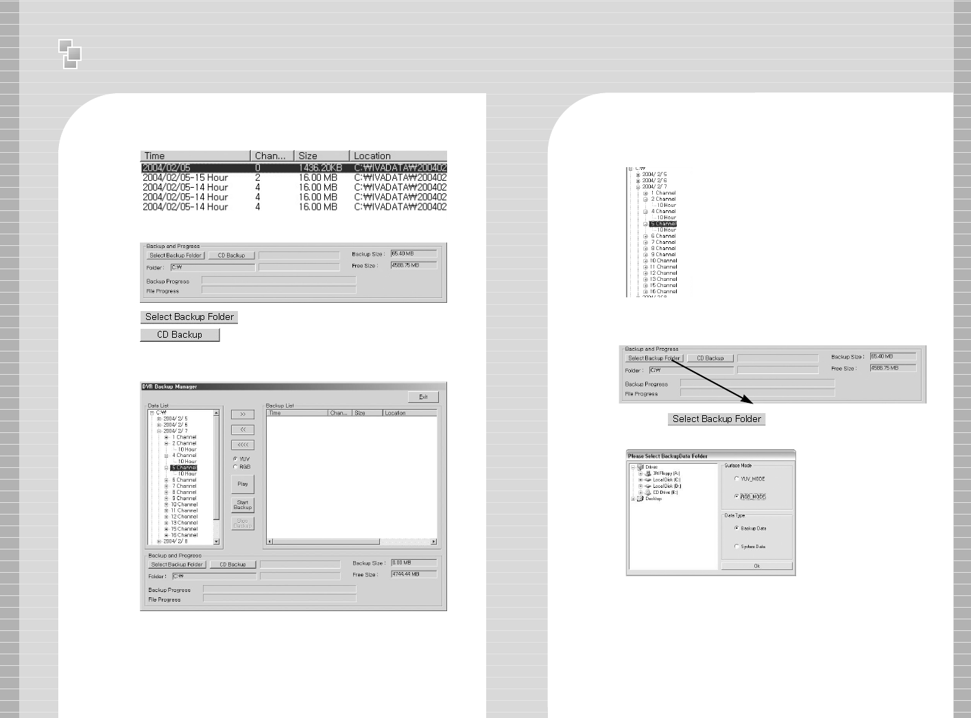 11 )) Backup Manager illustrates recorded data by date, channel and time.